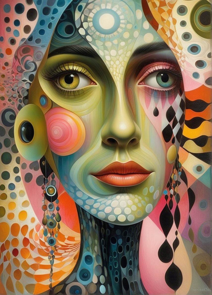 The image features a vibrant, abstract portrait of a woman, characterized by swirling patterns, bold colors, and striking eyes, merging surrealism with a modern artistic flair.