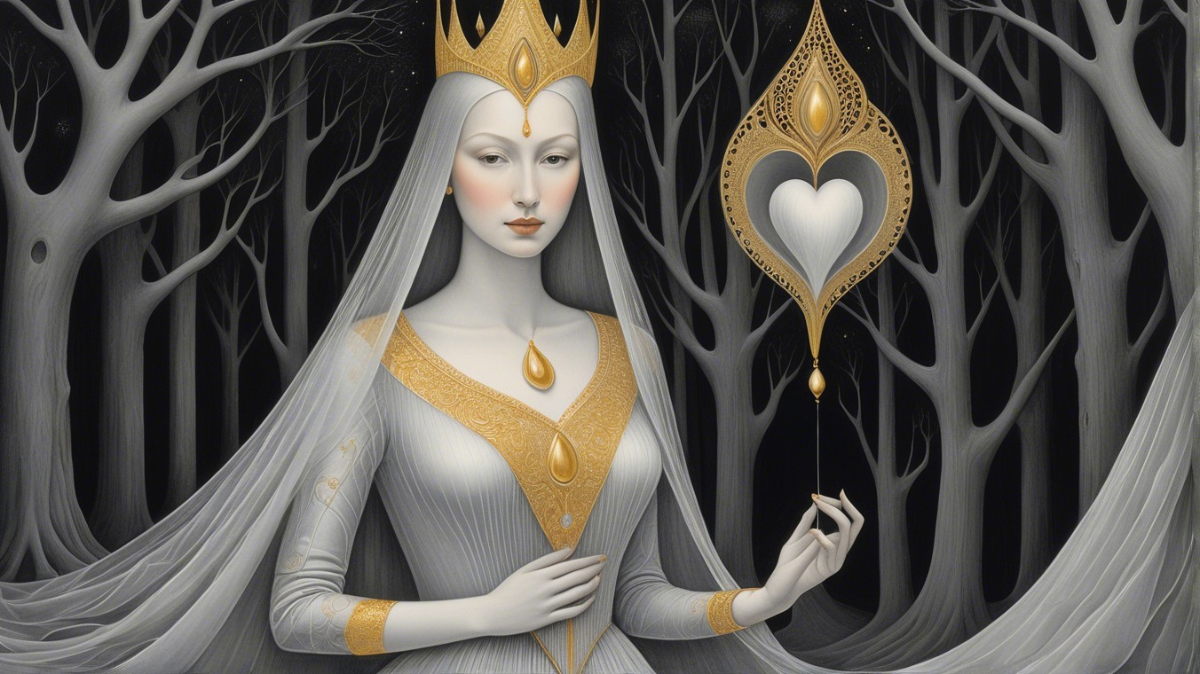 A serene woman in a regal gown and golden crown stands against a dark, mystical backdrop. Ethereal trees and a lantern add to the enchanting atmosphere of the scene.