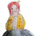 A cheerful girl with bright red hair smiles widely, wearing a yellow cardigan over a white shirt, complemented by a playful black skirt. Her joyful expression emanates warmth and innocence.