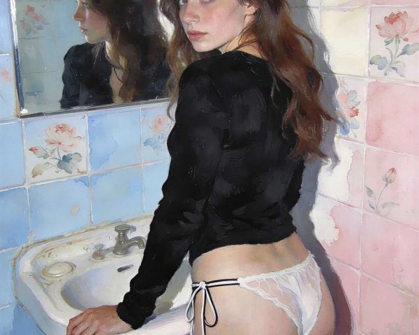 A young woman with long, wavy brown hair stands in a vintage bathroom, leaning slightly against a white pedestal sink with ornate detailing and a chrome faucet. She is turned partially away from the viewer, looking back over her shoulder with a calm, introspective expression, her brown eyes meeting the gaze