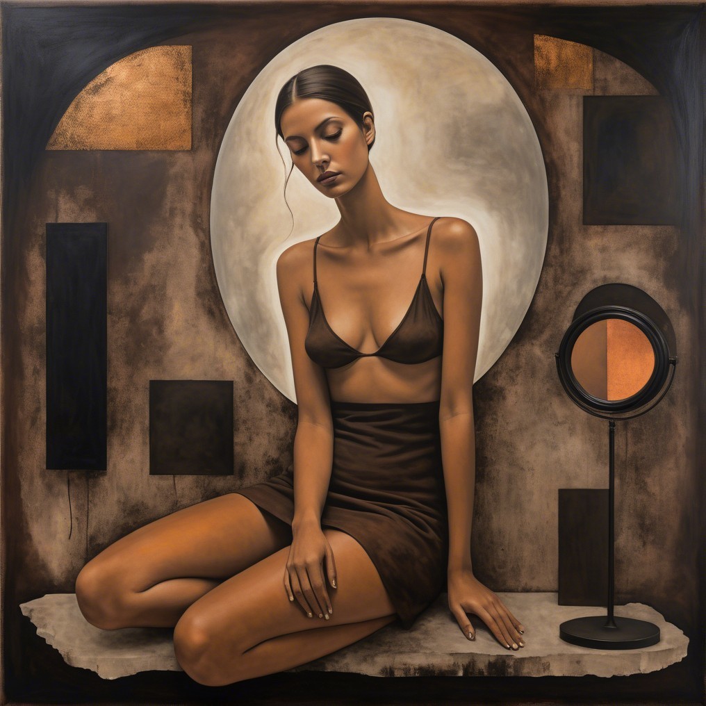 Create a minimalistic expressionistic painting which illustrates this concept: "The truth is not far from us; it is within us." "Solitude can do funny things to the mind . foggy nostalgia, portrait in Burnt umber and salmon gold, smoke and mirrors, patina of, battery acid, art brut, moody, somber, desaturated colors, in the style of Paul Klee, Arthur Rackham Dark and moody oil painting of a woman with piercing black eyes, inspired by the works of John Singer Sargent and Edgar Degas, long shot, realistic texture, dramatic lighting, intricate details on clothing and Magical woman fading tones of melancholy and summer nostalgia, soulful portrait, in burnt umber, plutonium, patina of mercury glass, tea stains, art brut, moody, somber, desaturated colors, in the style of Paul Klee, Banksy, Arthur Rackham, based on Prompt by KRW