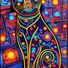 A vibrant, stylized cat with striking orange and black fur sits against a swirling blue backdrop filled with bright stars. The painting features bold brushstrokes and a warm, fiery ground.