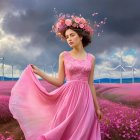 A young woman in a flowing pink dress stands in a vibrant field of pink flowers, adorned with a floral crown. Behind her, wind turbines tower under a dramatic sky filled with clouds.