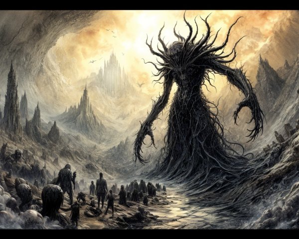 Explore a haunting dystopia filled with mechanical monstrosities and cybernetic beings. The dark atmosphere features metallic textures, intricate machinery, and a striking red and black color scheme.