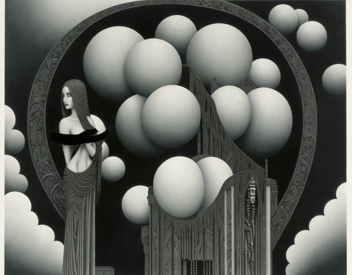 A monochromatic artwork featuring a woman, large spheres, and gothic architecture with ornate details, all under a circular frame.