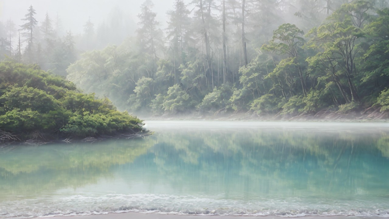 A tranquil lake surrounded by lush greenery and misty trees. The still water reflects the serene landscape, creating a peaceful, almost dreamlike atmosphere.
