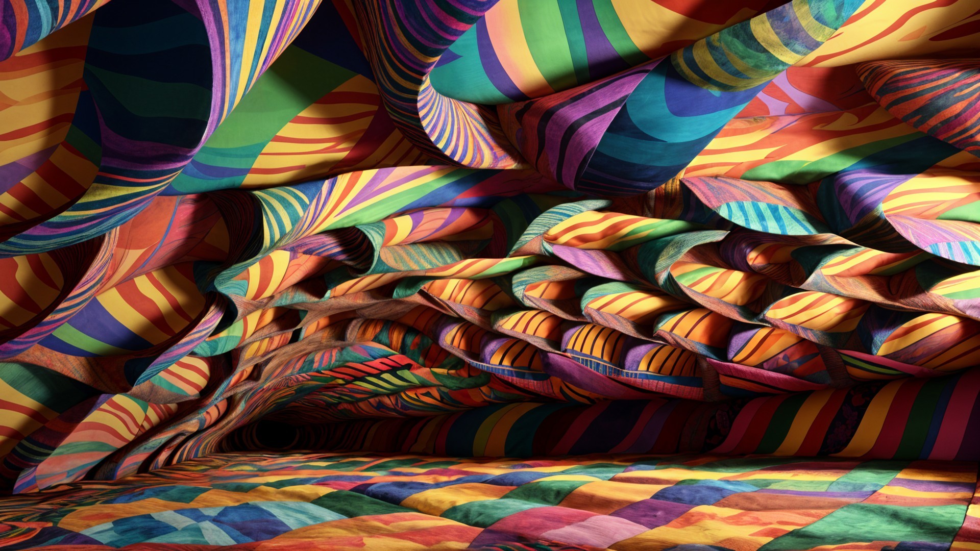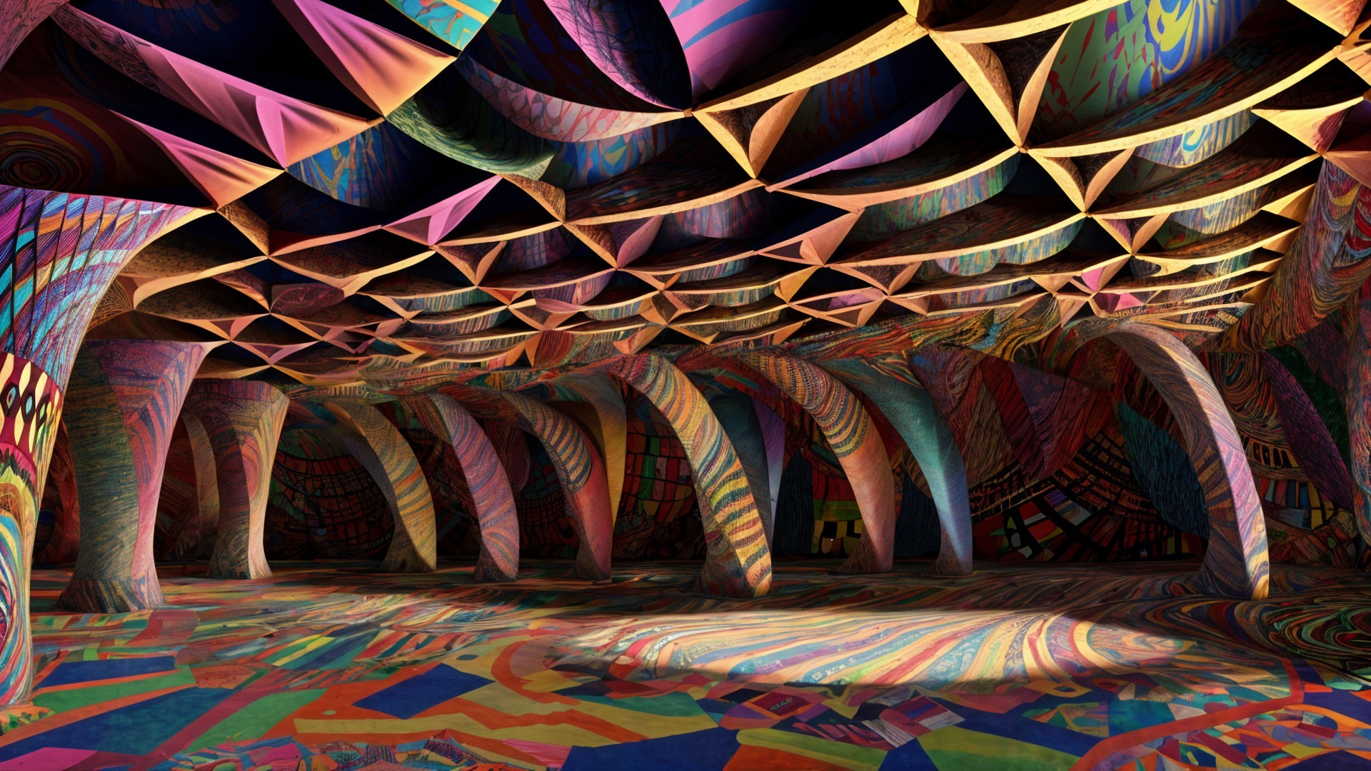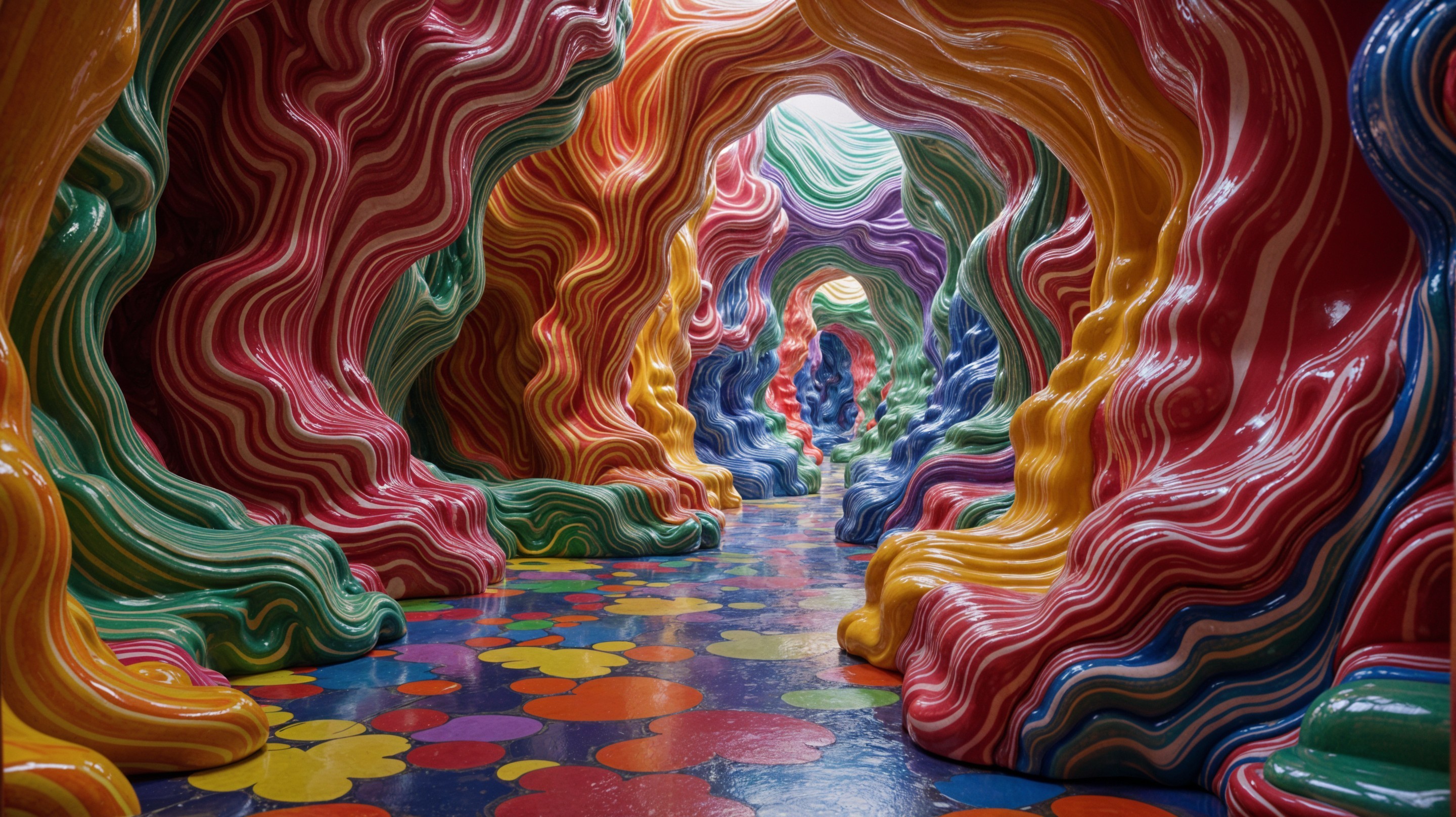 A vibrant, swirling landscape filled with colorful, fluid patterns and shapes. The space is alive with bold hues, rounded elements, and a warm glow emanating from a bright doorway.