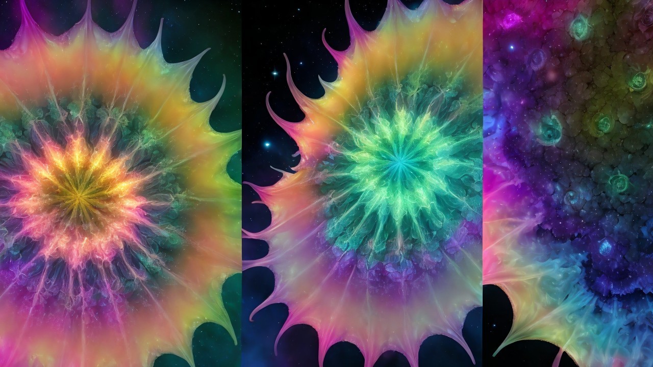 A vibrant abstract design features two intricate flowers with swirling petals in shades of orange and teal, set against a dark background, creating a stunning visual contrast.
