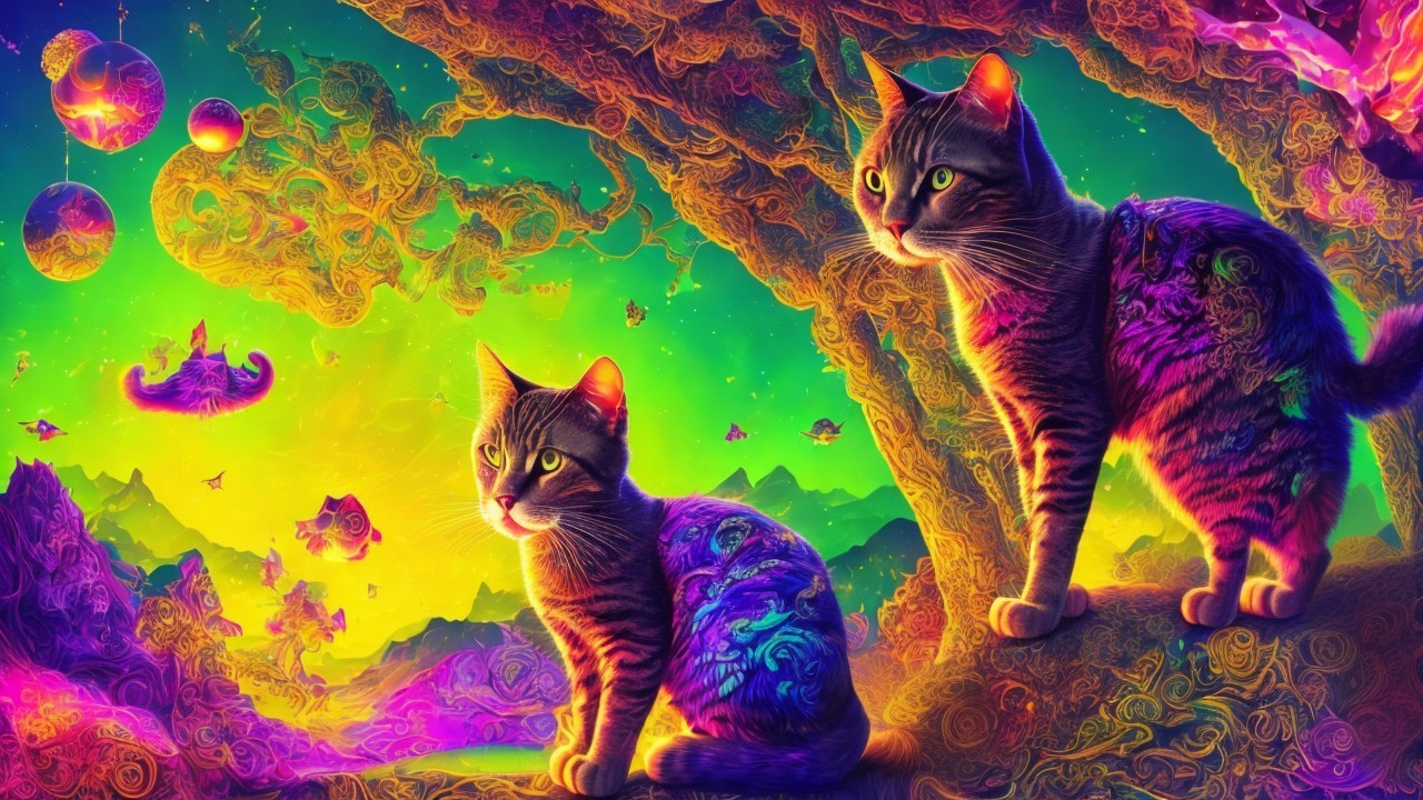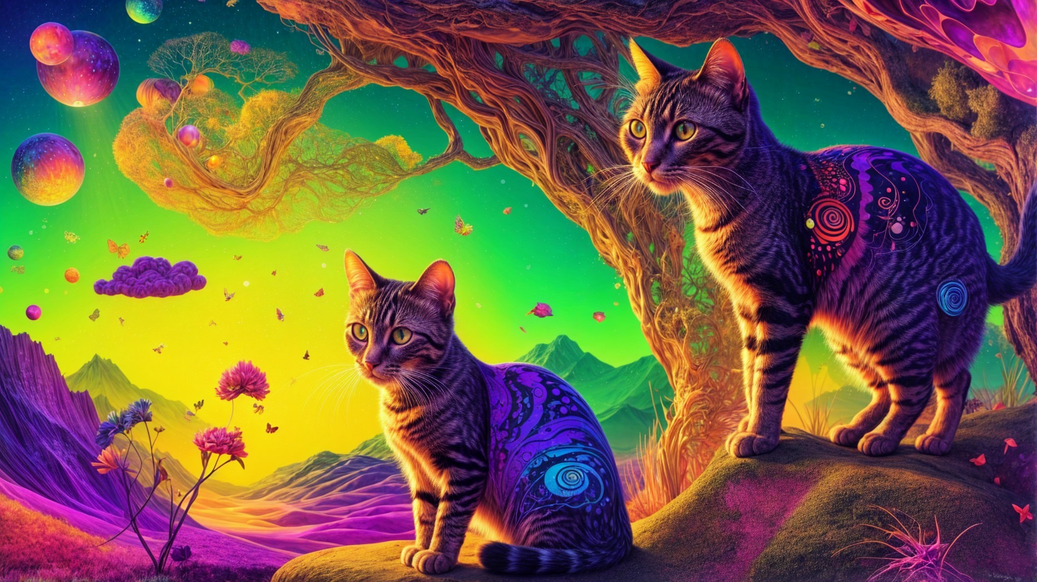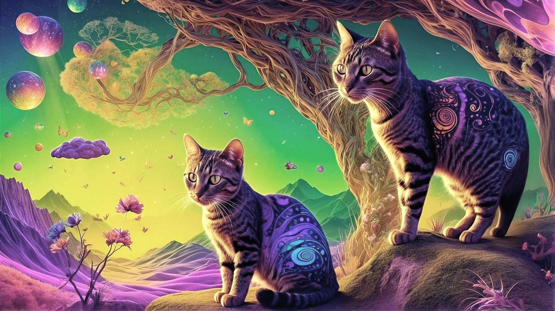 Two stylized cats with swirling patterns on their fur stand on a vibrant landscape filled with whimsical trees, colorful clouds, and planets, creating a surreal, cosmic atmosphere.