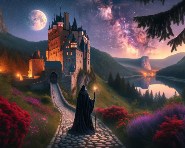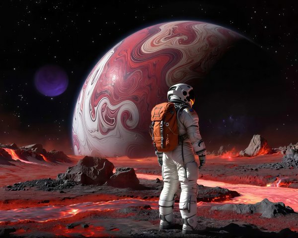 A stunning woman in a sparkling blue gown stands on a sandy landscape, gazing at the massive, colorful planet Jupiter in the star-filled sky, blending elegance with cosmic beauty.