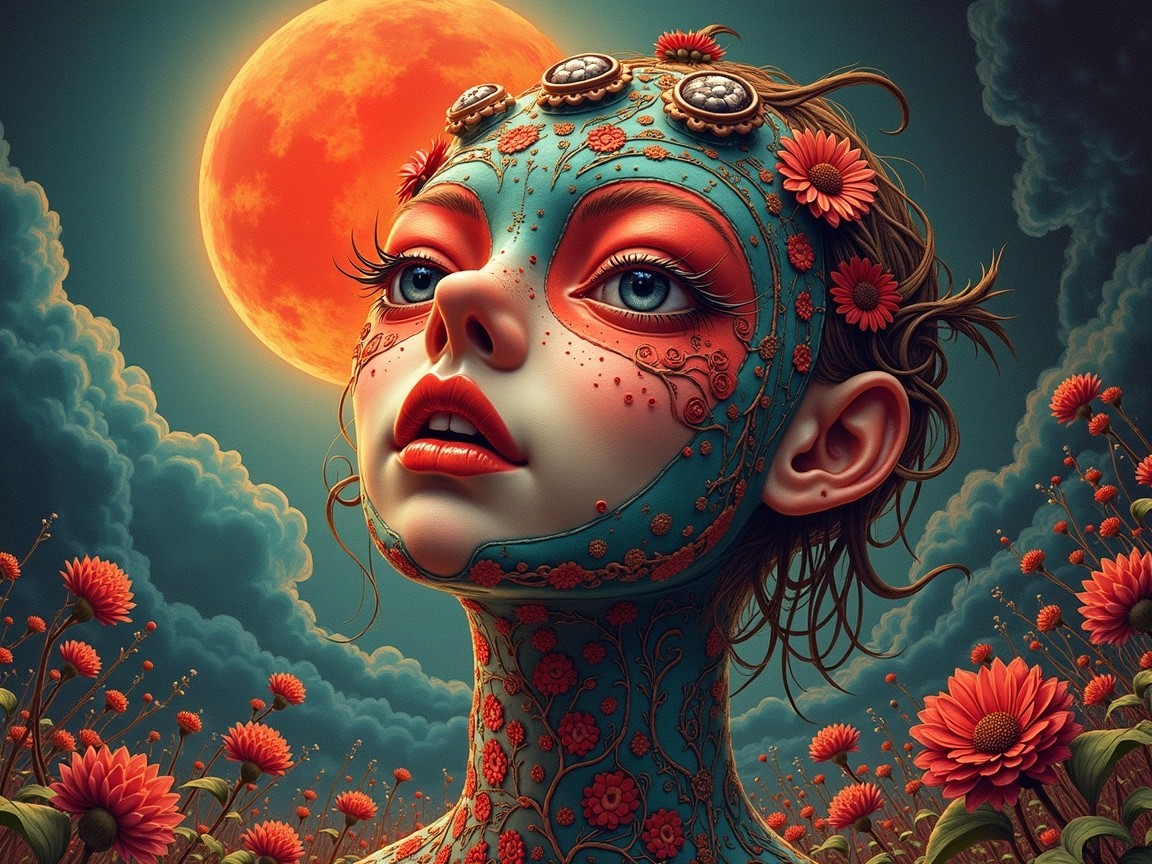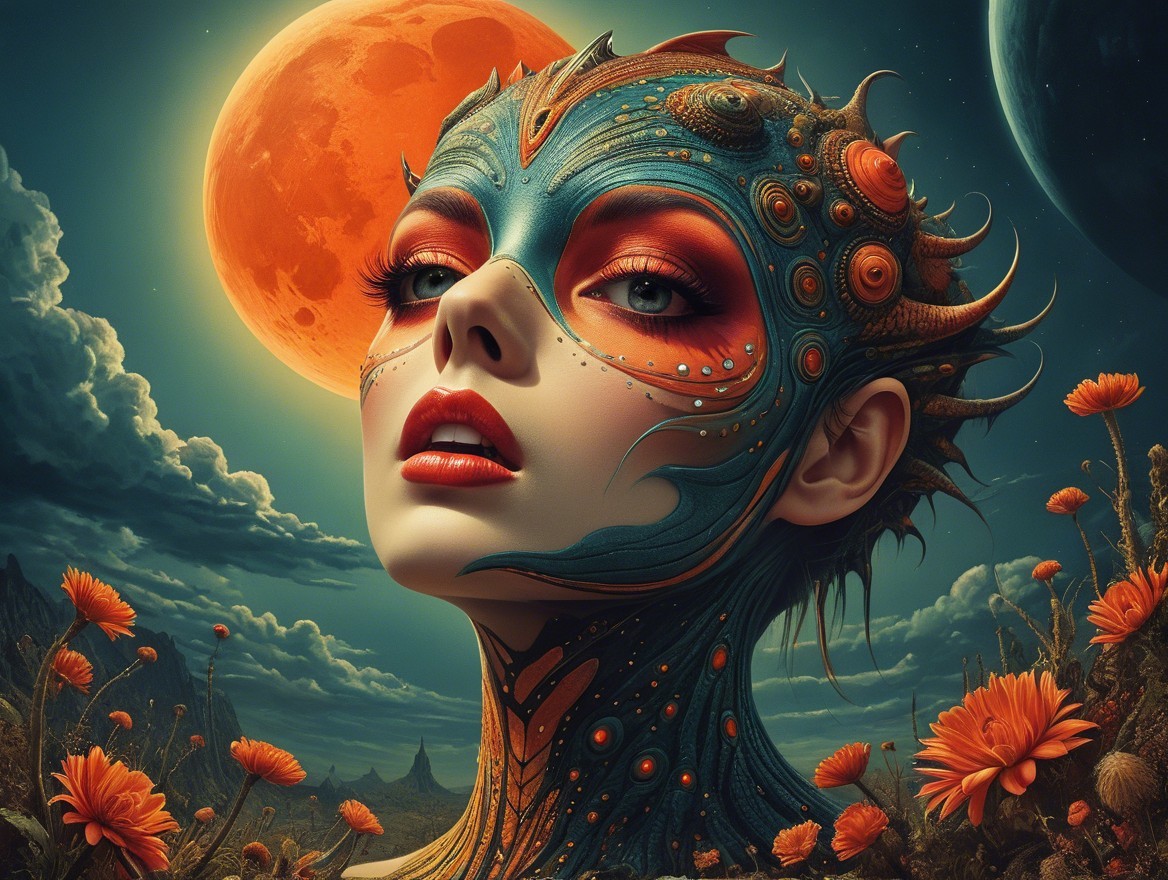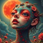 A stunning surreal portrait of a woman with intricate face paint, featuring vivid colors and organic motifs. A large orange moon and floating fish add to the enchanting, dreamlike atmosphere.