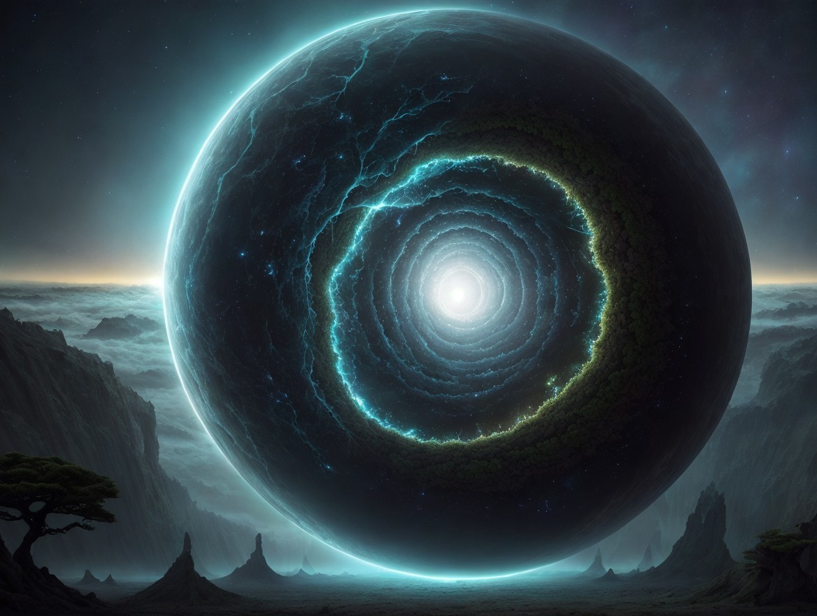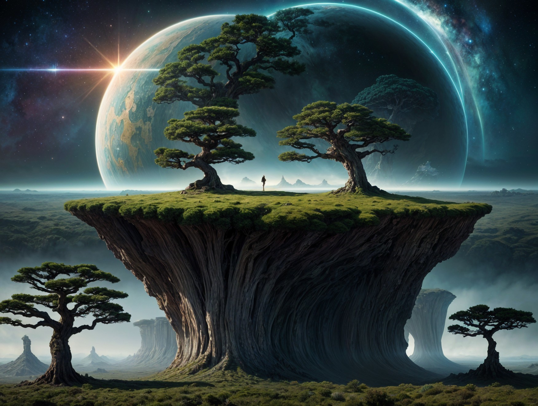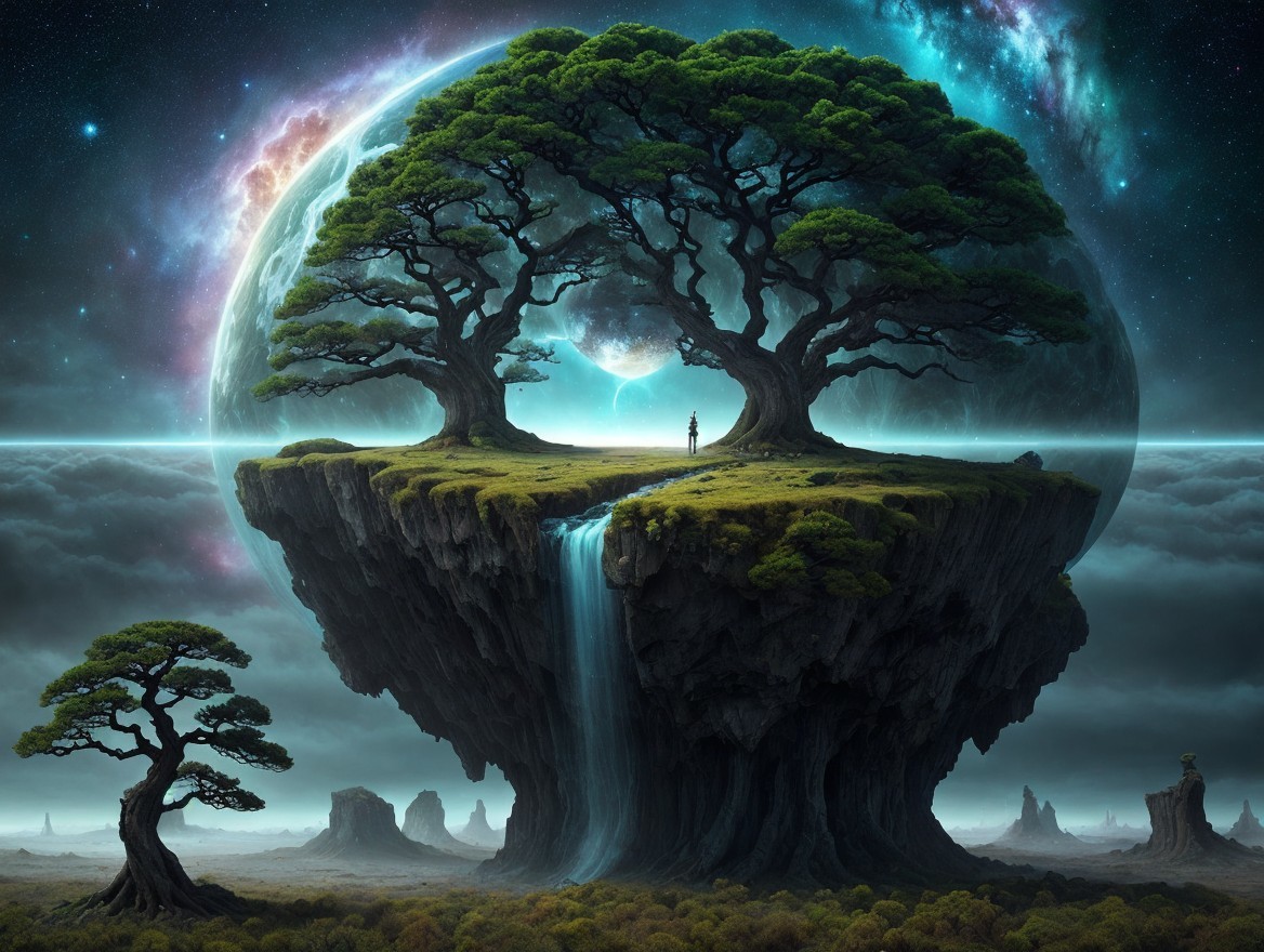 A surreal landscape features a floating island with lush greenery and cascading waterfalls. Majestic trees stand tall against a backdrop of a celestial sky, creating a dreamlike atmosphere.