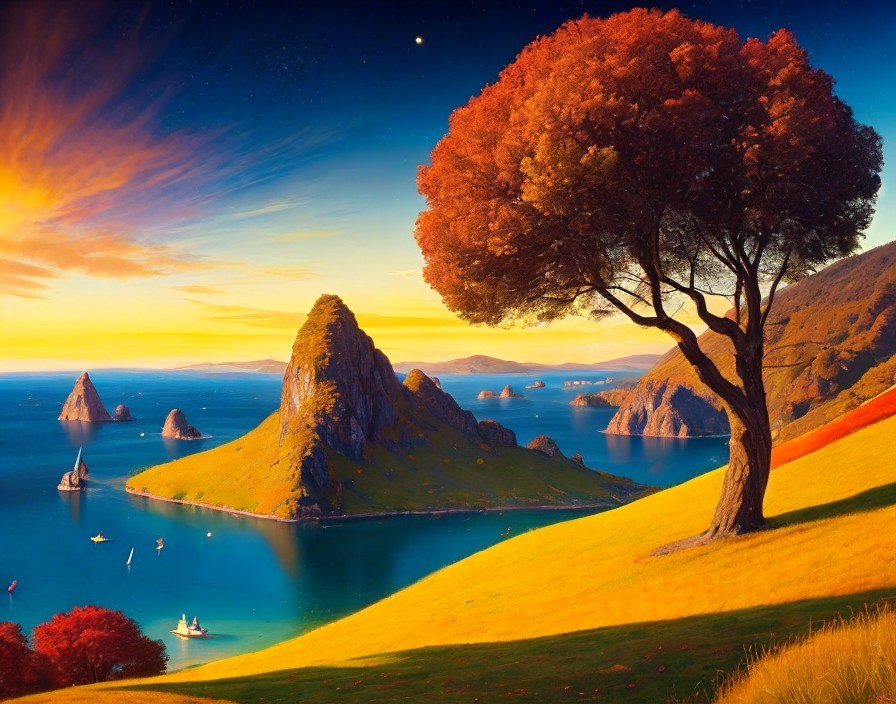 Renaissance painting: Castle town on island with two moons, lush greenery, large tree