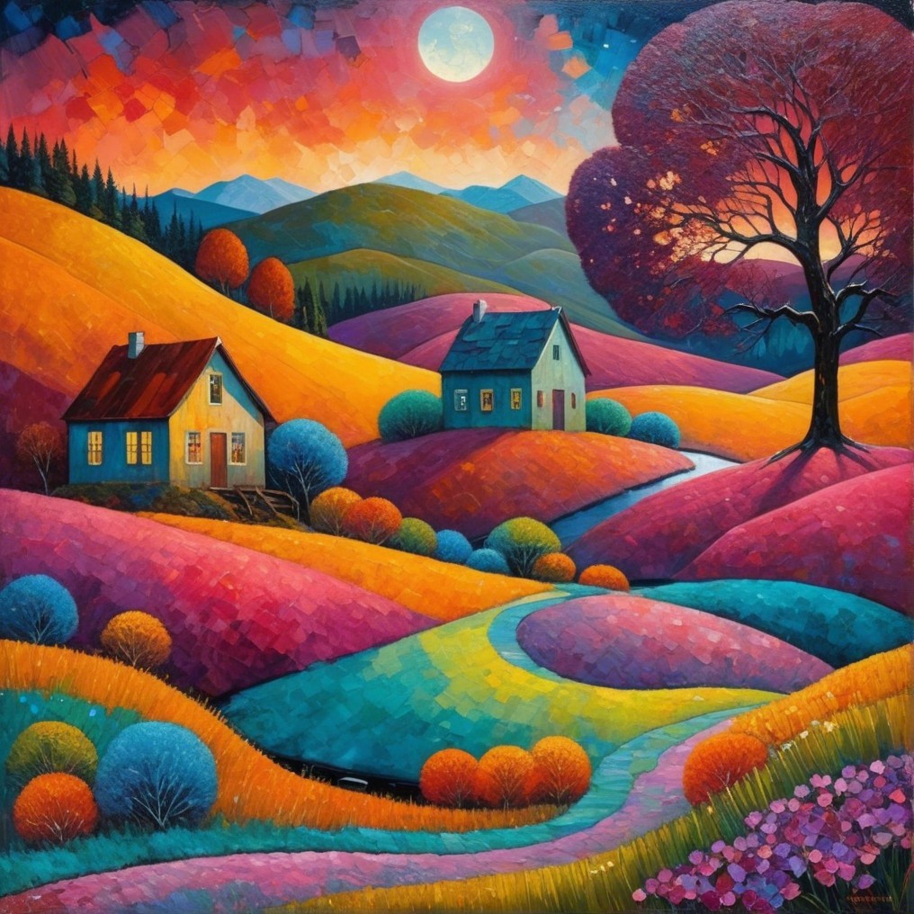 A vibrant, colorful landscape showcases rolling hills with two charming houses, surrounded by trees and shrubs. A winding river reflects the glowing sunset, creating a serene, idyllic atmosphere.