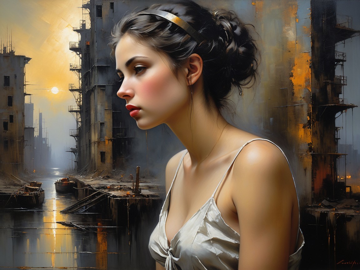 Prompt: "Enigmatic young maiden with an introspective gaze, lost in thought, set against a distressed, industrial background with vertical streaks and metallic accents, reminiscent of a worn, urban landscape. The oil painting, inspired by the expressive brushstrokes of Pino Daeni, blended with the dark, mystical undertones of Zdislaw Beksinski and the fantastical, symbolic elements of Luis Royo. Ink and oil on canvas, with intertwined features, layered textures, and fragmented elements, evoke a sense of mystery and unease. Moody atmosphere, with a predominantly dark color palette, blending black, gold, and earthy brown tones, creates a sense of depth and contrast. German Expressionism's emotional intensity and modern abstract art's experimentation, merged with a touch of surrealism, result in a dreamlike, thought-provoking portrait, where the subject's thoughts and emotions seem to blur and blend with the surrounding environment."