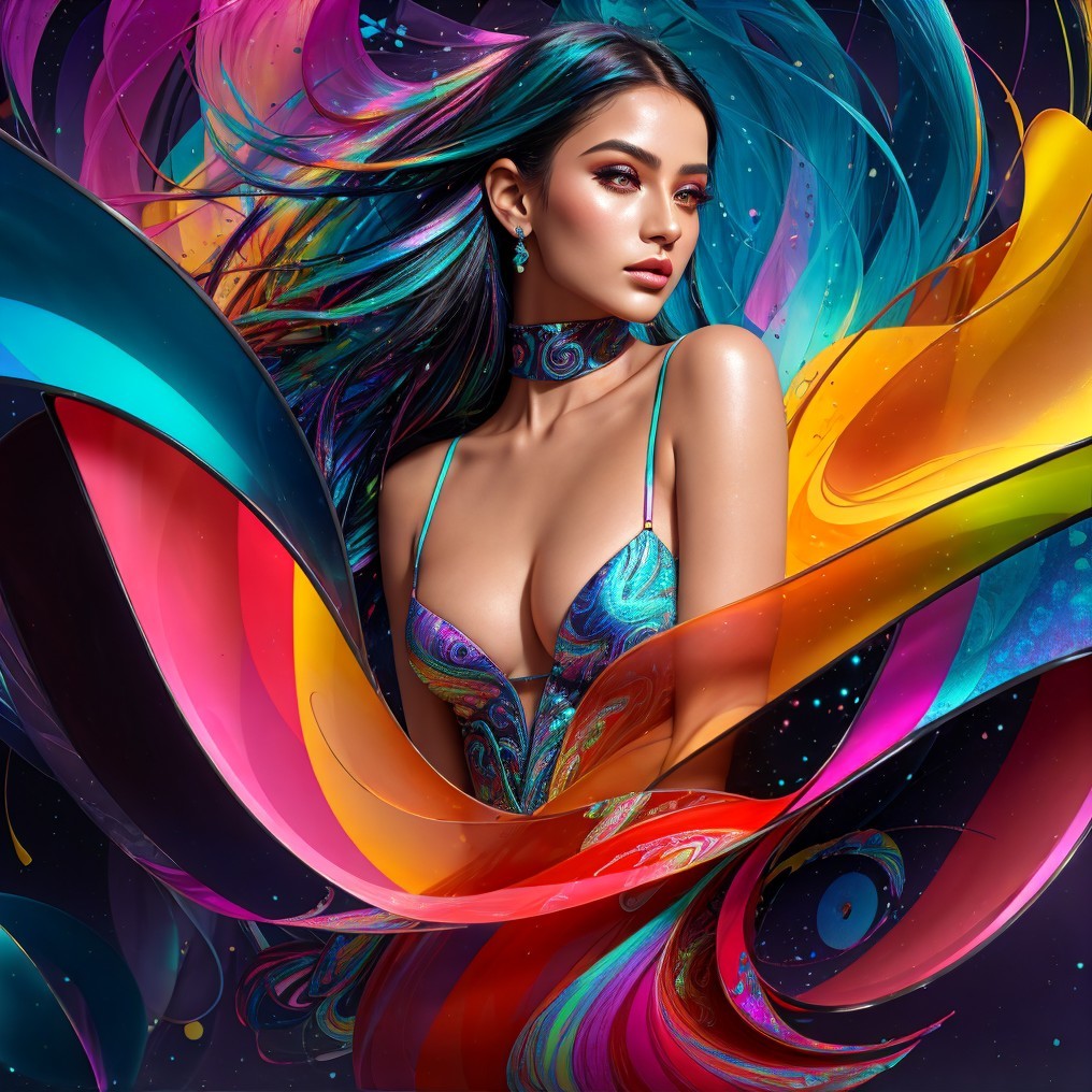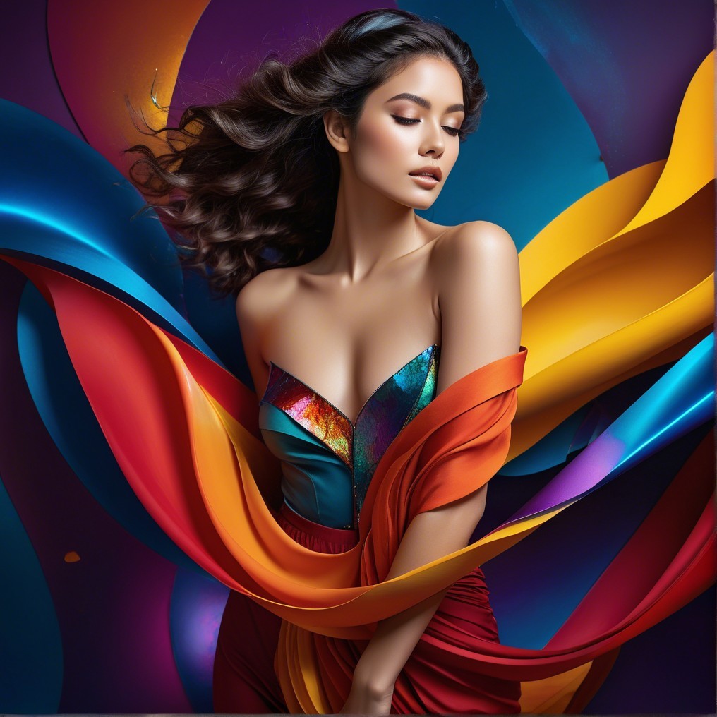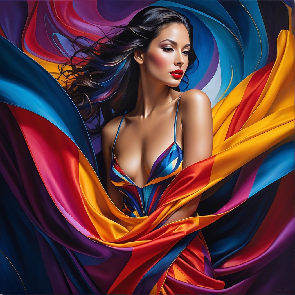 A striking, colorful portrait of a woman draped in vibrant, flowing fabrics. Her confident pose and lush hair contrast beautifully with the vivid background of deep blues and warm yellows.