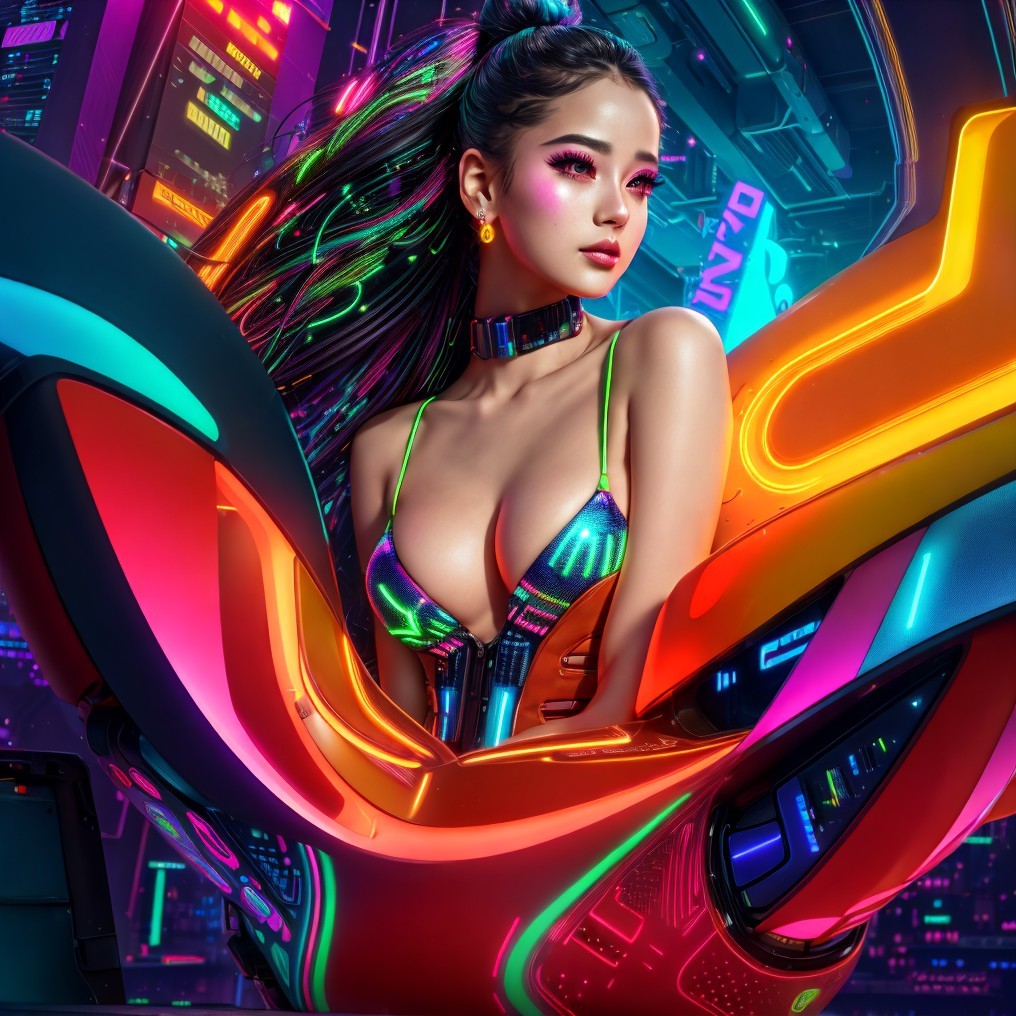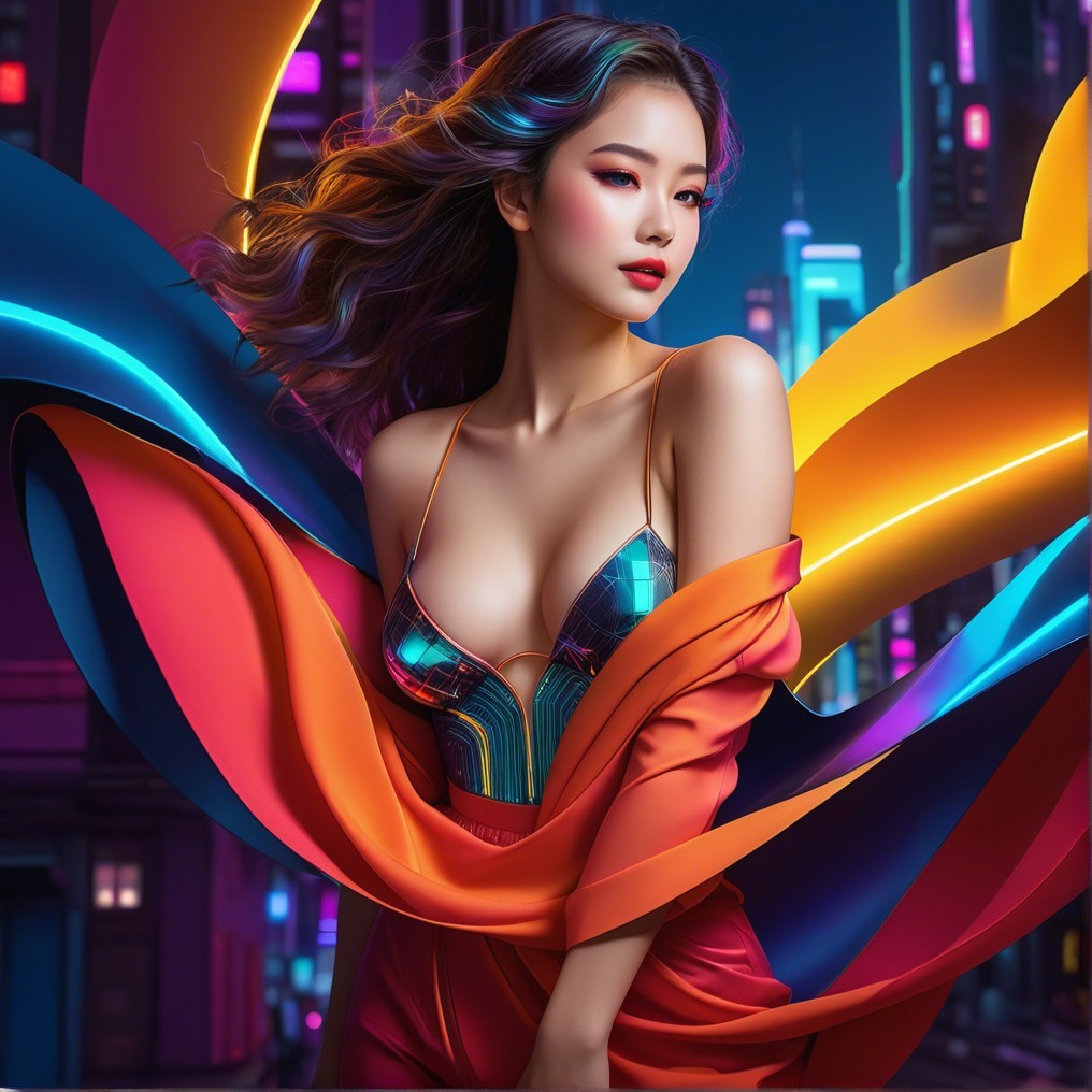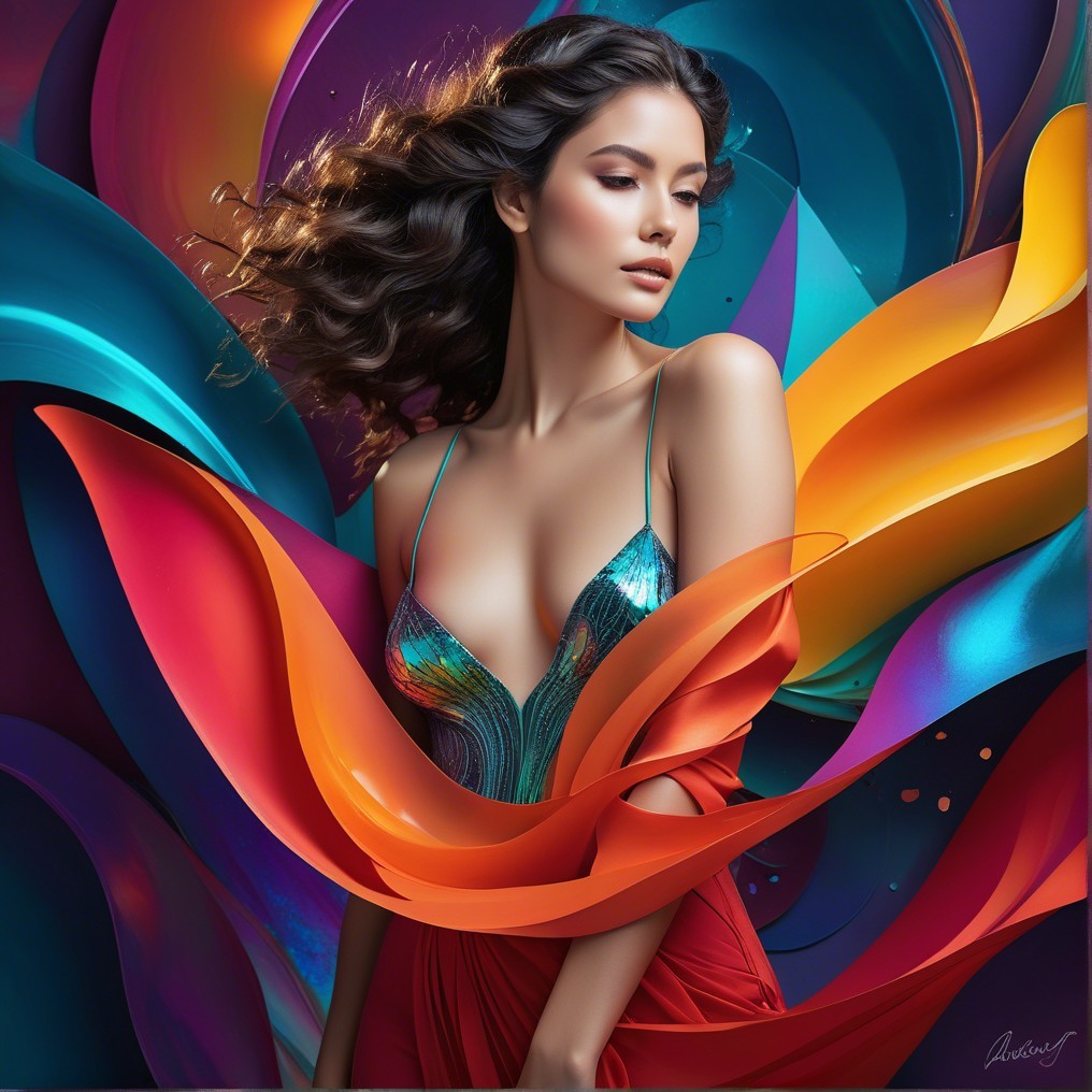 A striking, colorful portrait of a woman draped in vibrant, flowing fabrics. Her confident pose and lush hair contrast beautifully with the vivid background of deep blues and warm yellows.