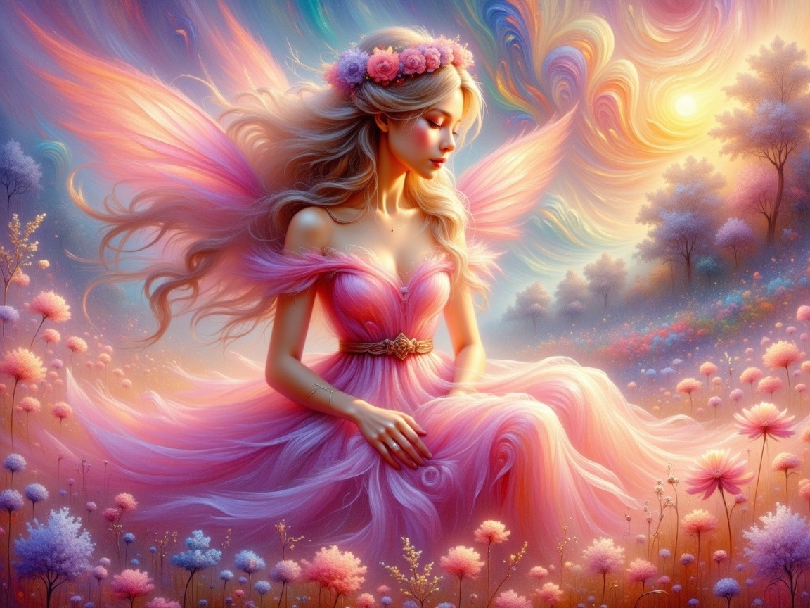 A captivating fairy with long pink hair and delicate wings sits gracefully among roses. Dressed in a pink outfit, she emanates a whimsical charm against a magical castle backdrop.