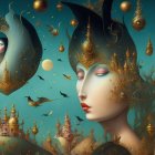 The image features intricately designed ethereal figures with flowing hair and golden accents, set against a serene turquoise background, embodying a mystical and artistic atmosphere.