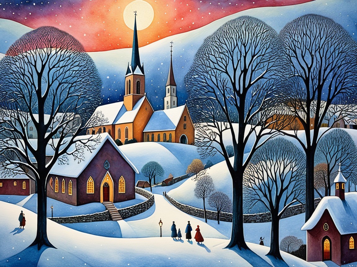 A picturesque winter scene features a quaint village with snow-covered rooftops, two churches, and a glowing moon. People stroll together, surrounded by tall, bare trees. Serene and festive.