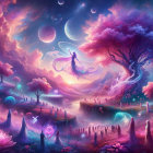 In a surreal landscape, ethereal figures in flowing dresses stand amidst blooming pink flowers and glowing orbs. A majestic tree and distant planets create a magical, dreamlike atmosphere.