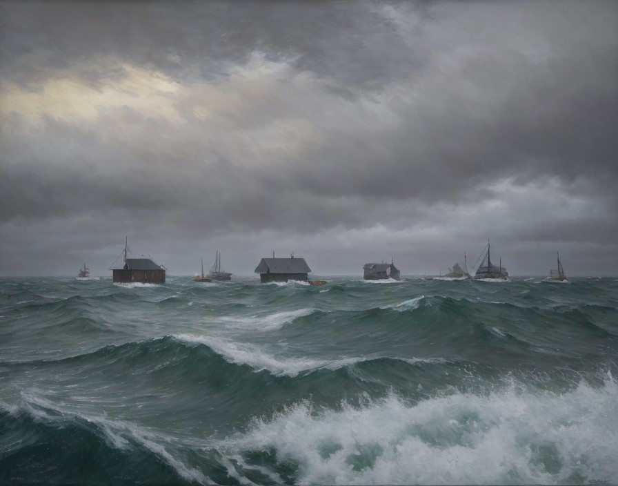 (Try it from Norman Dick) - Stormy sea with towering waves, houses and boats adrift under a tumultuous sky.