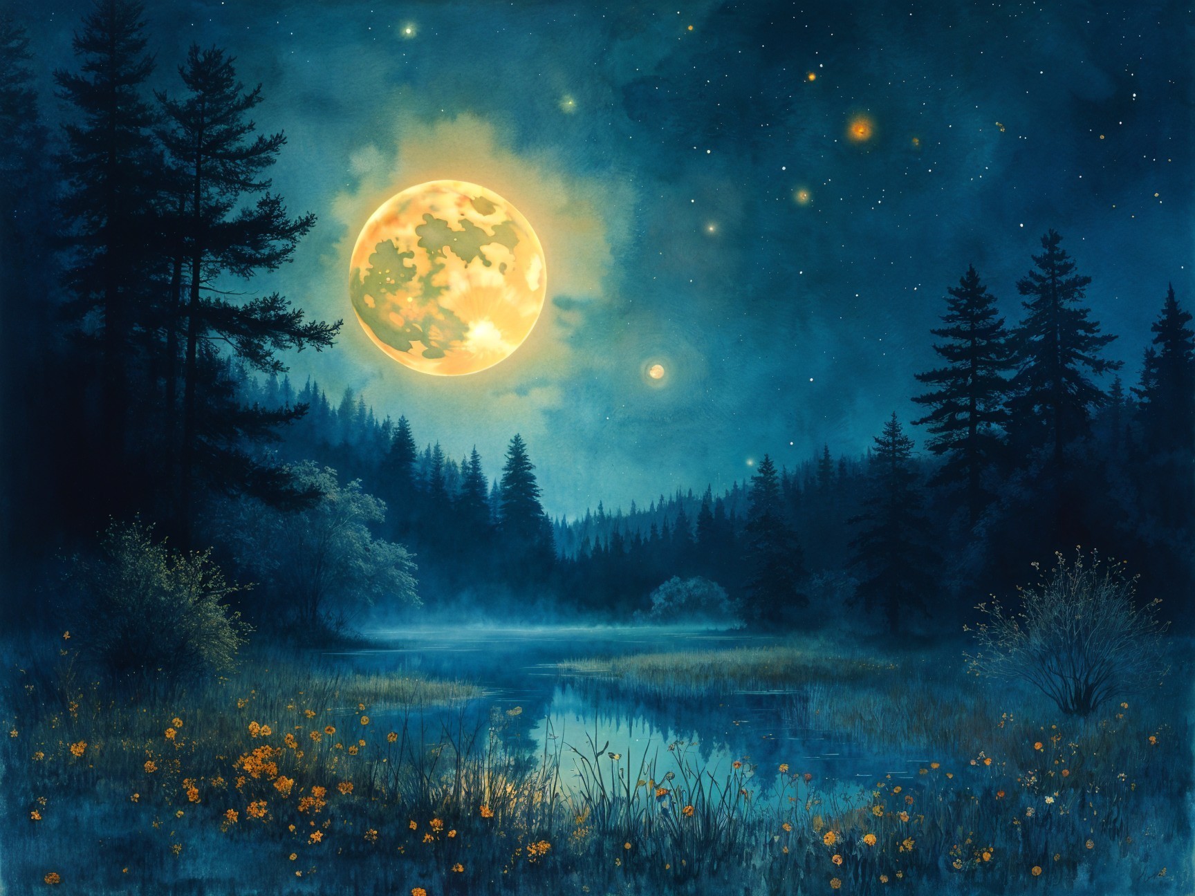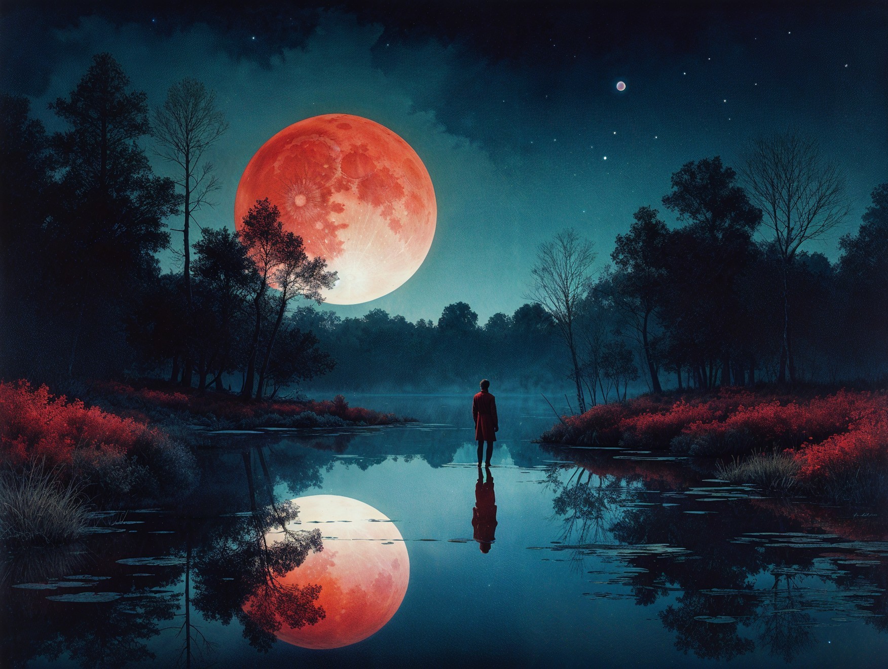 A serene scene featuring a deep red moon illuminating a calm lake. A solitary figure in a boat reflects on the water, surrounded by lush trees adorned with autumn hues, creating a tranquil atmosphere.