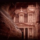A stunning nightscape features ancient columns illuminated against a backdrop of the Milky Way, showcasing vibrant stars and cosmic colors over a rocky landscape.