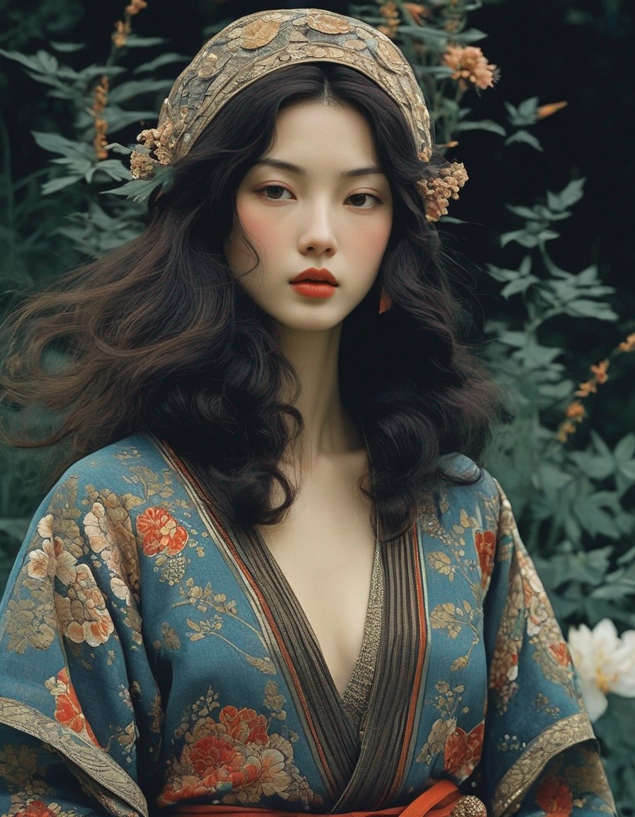 A woman with wavy hair, wearing a traditional outfit with floral patterns and a decorative headpiece, poses against a muted backdrop.
