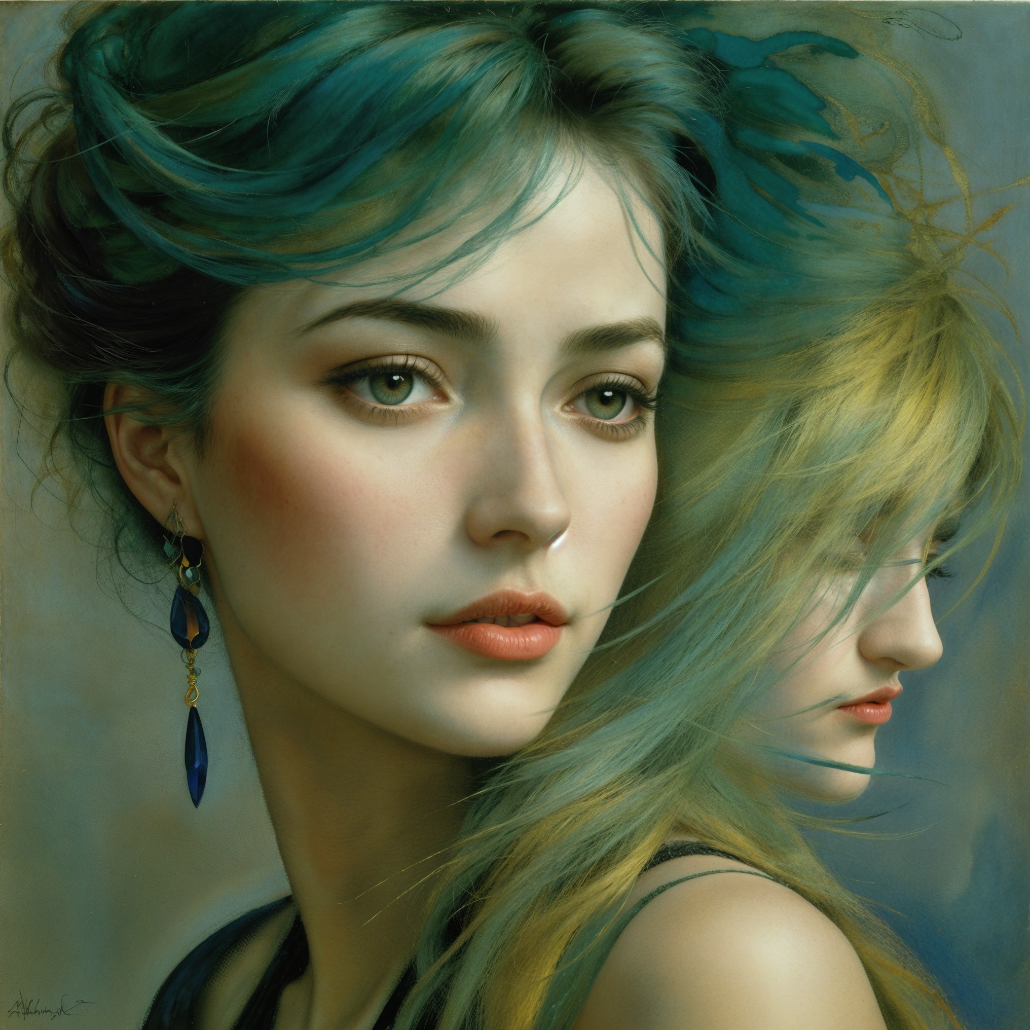 This portrait features a young woman with striking green eyes and soft, wavy hair adorned with a blue ribbon. She wears an elegant, draped garment, exuding a timeless beauty and grace.