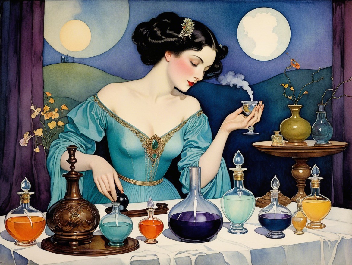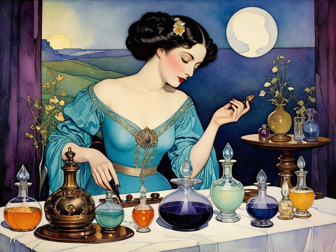 A graceful woman in a pale blue dress delicately mixes colorful potions in elegant glass bottles. Dimly lit by a full moon, she exudes a mystical, enchanting atmosphere.