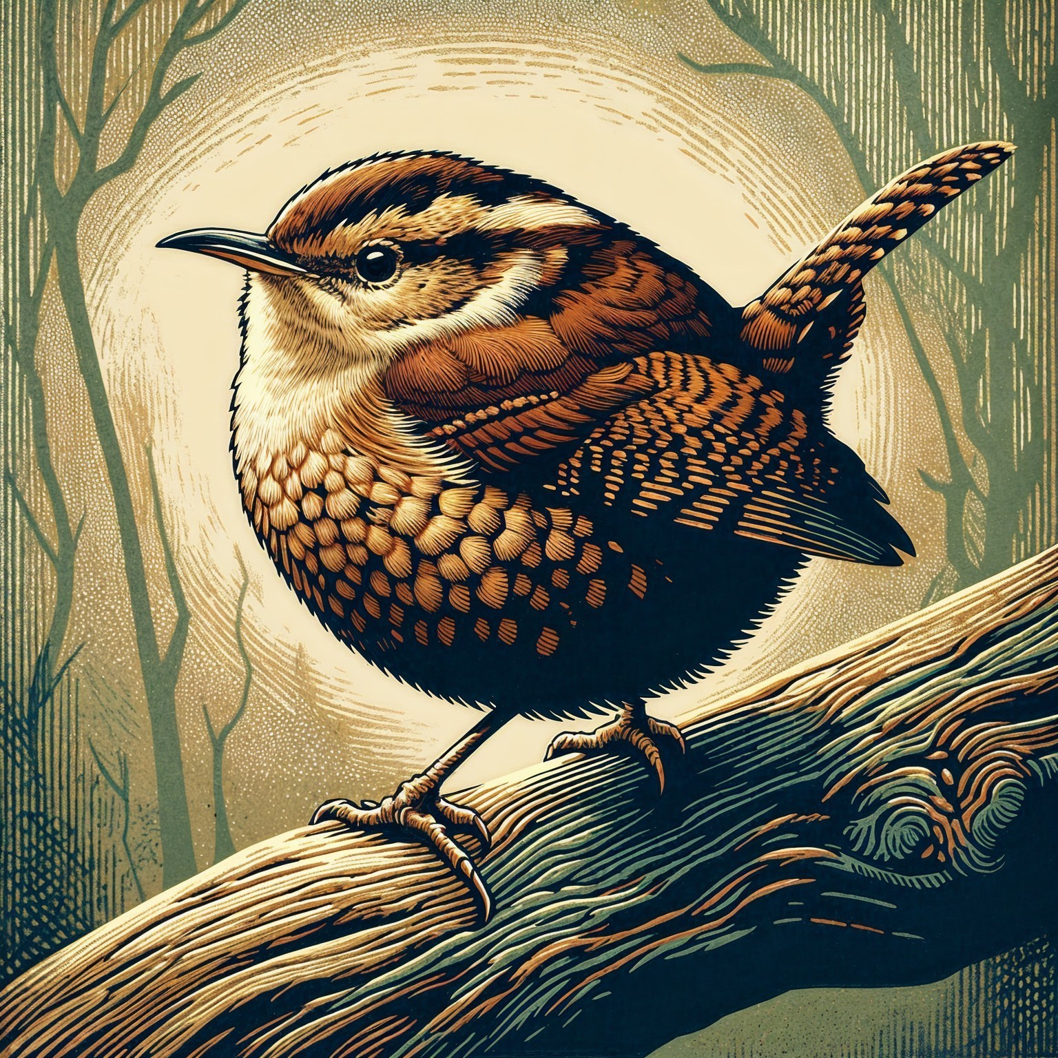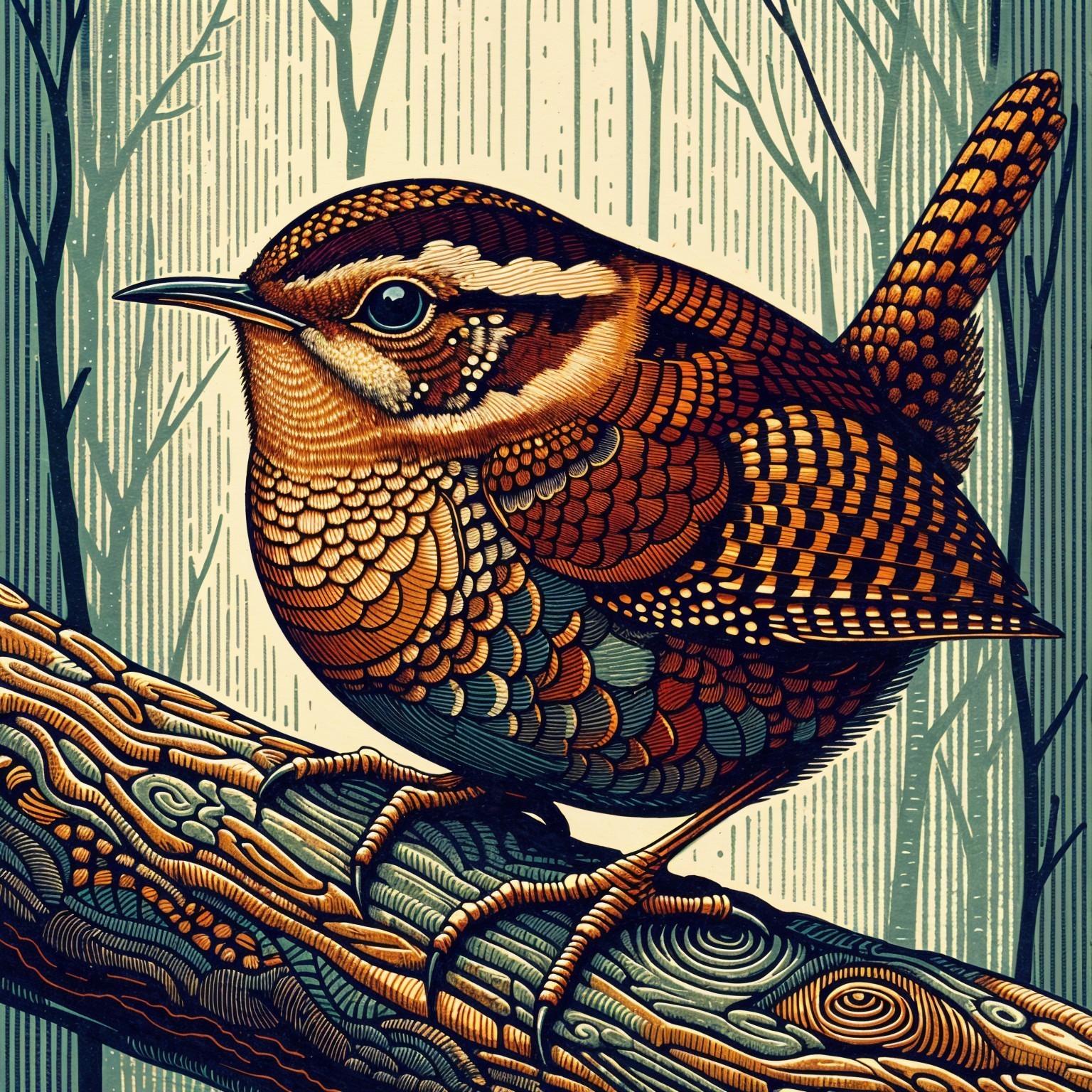 A colorful bird with intricate patterns sits perched on a snowy branch, surrounded by stylized winter trees. Its warm hues contrast beautifully with the cool blue background.