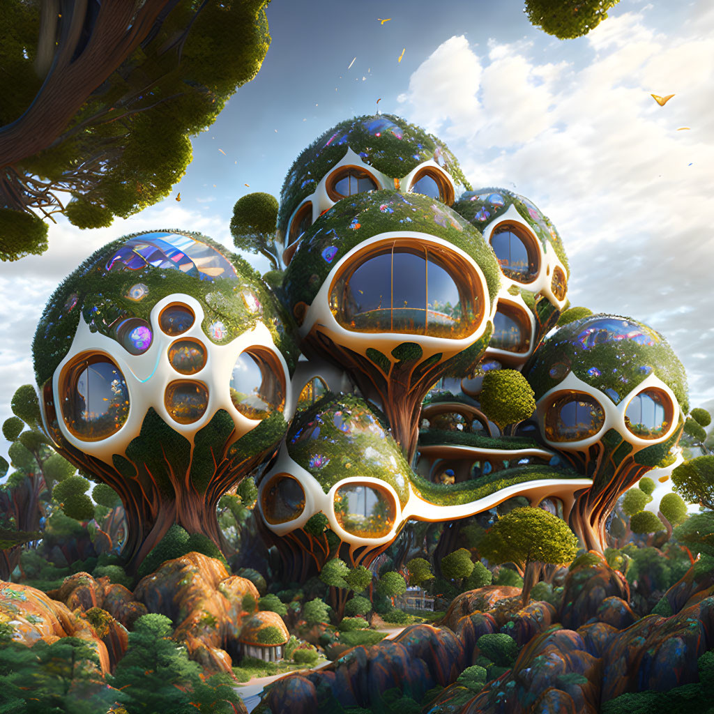 Prompt: Metamorphic parametric organic synthetic houses in a giant tree, full hd octane render Image Art by Art by Jacek yerka, Hieronymus Bosch, Luis Ricardo Falero, Anato Finnstark. Iridescent glow, 3d.