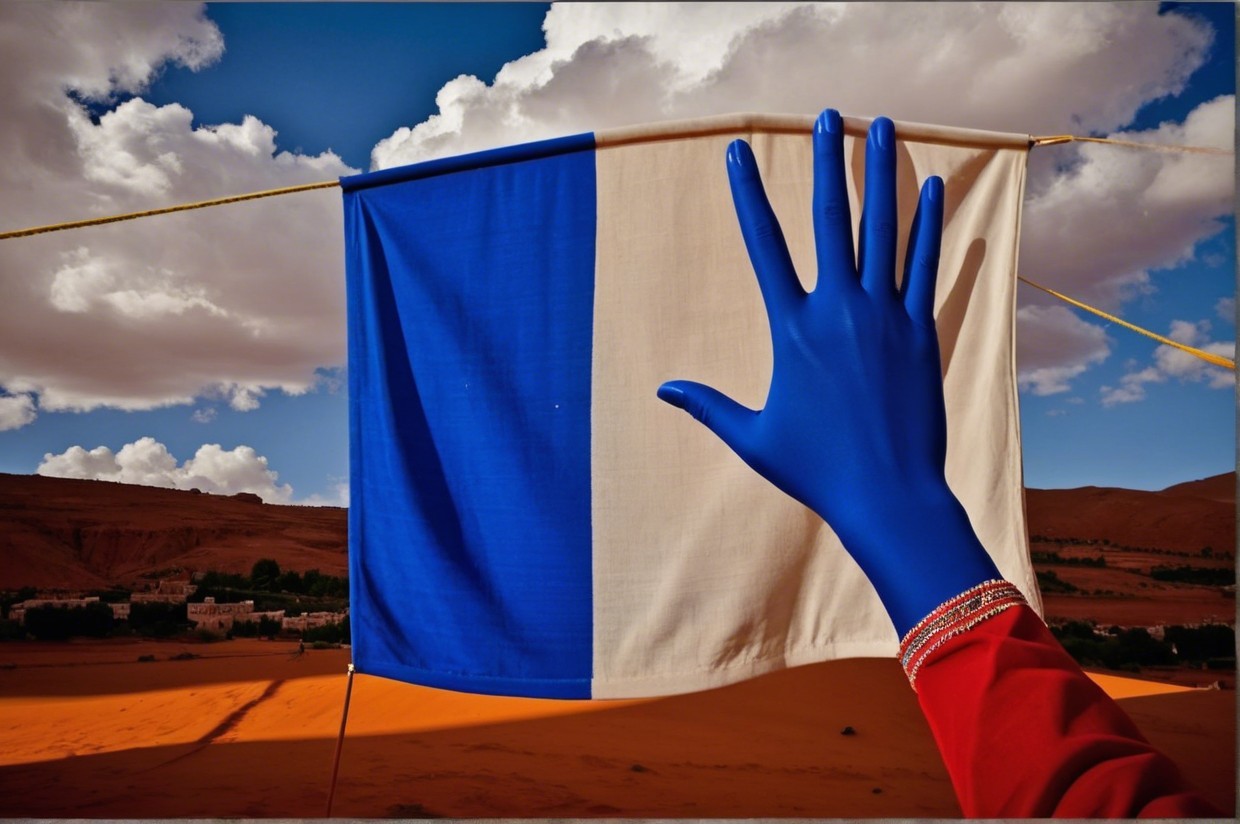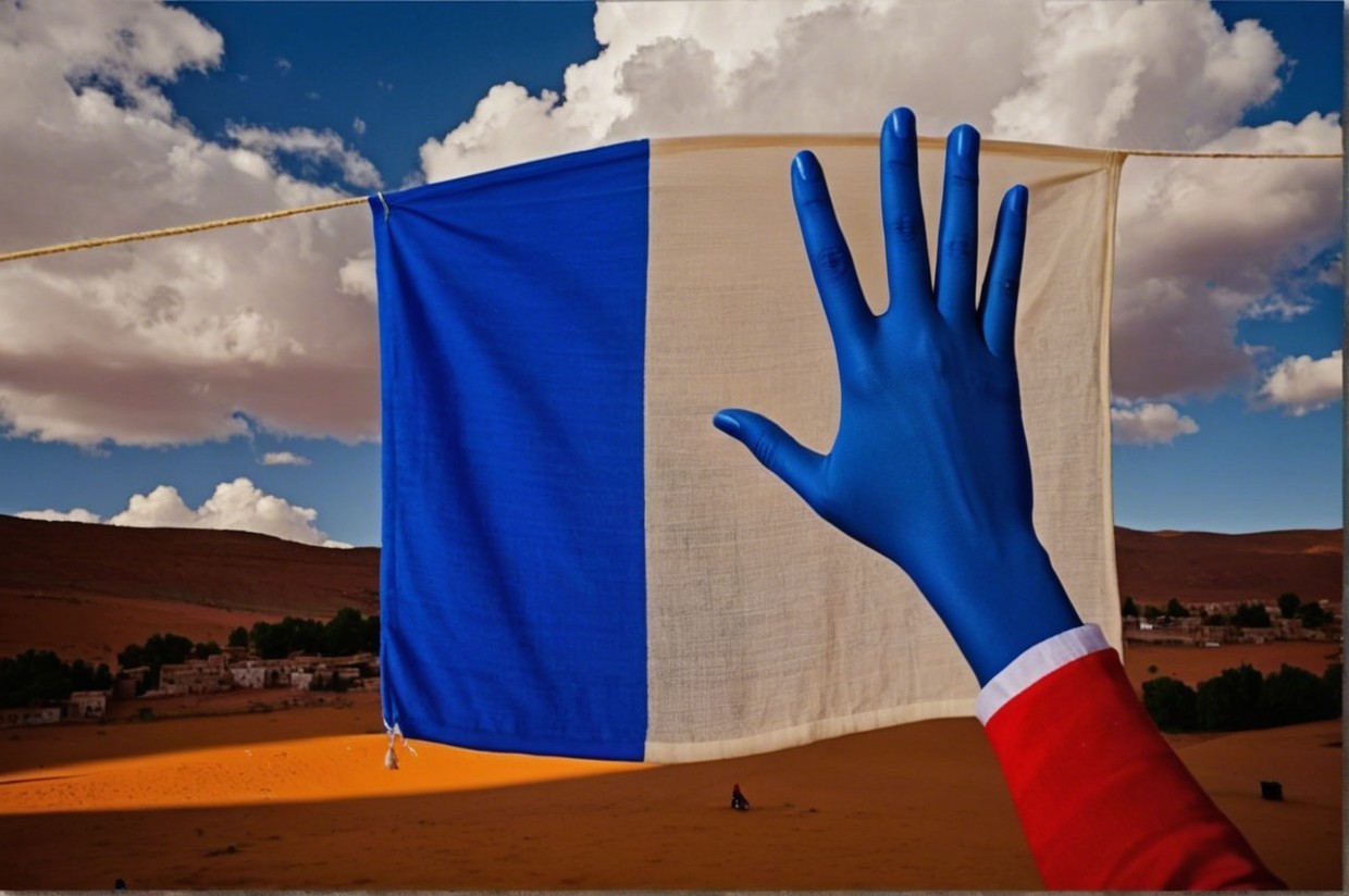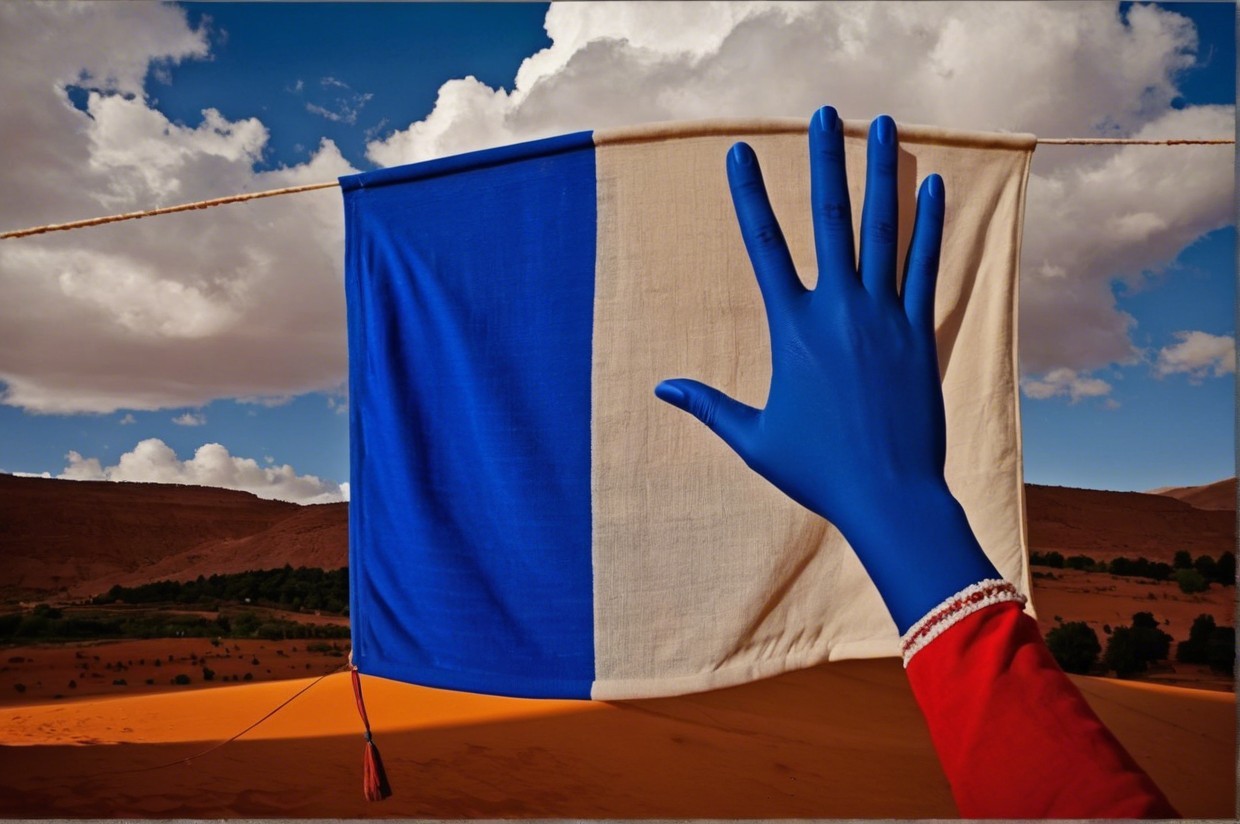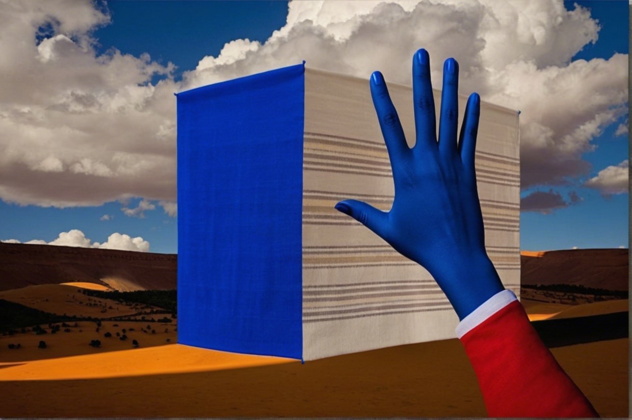 A vibrant blue hand reaches toward a large flag split into blue and white, set against a backdrop of sandy dunes and fluffy clouds, evoking a sense of connection and cultural significance.