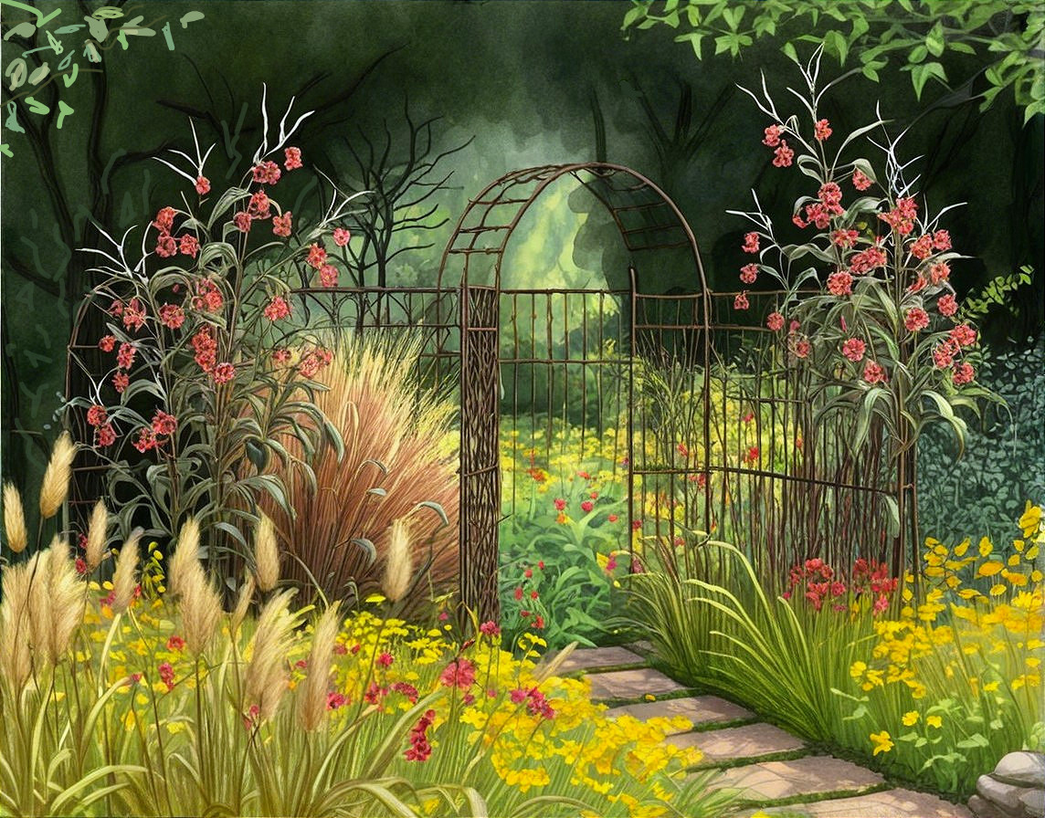 3D, colored with diluted watercolors, garden with sunbeam from behind, meadow with yellow and red blossoms, tall ornamental grass, campion, behind it wrought-iron brown trellis with leaf decorations, spirals and circular branches, dark deciduous hedge, extremely detailed, sharp focus smooth detailed background, shiny, sharpen, intricate botanical details, inspired by André Bauchant