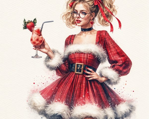 A whimsical winter landscape features a festive scene with a sleigh pulled by reindeer and a joyful crowd in a snow-covered village. A glowing wolf and vibrant aurora enhance the magical atmosphere.