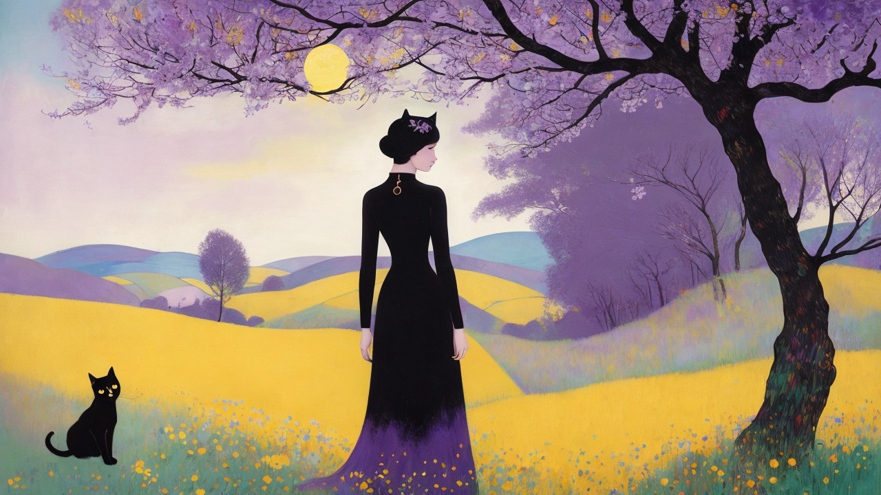 A woman in a flowing black dress stands in a vibrant, dreamlike landscape. Yellow fields stretch beneath a sky of soft purples, while a black cat watches nearby under a glowing moon.