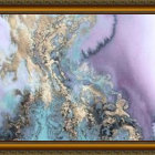 A whimsical watercolor illustration featuring a gentle gray elephant flanked by two colorful birds, set against a dreamy, soft-hued background of purples and blues in an ornate frame.