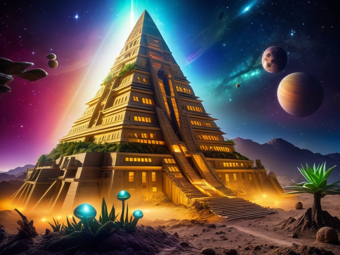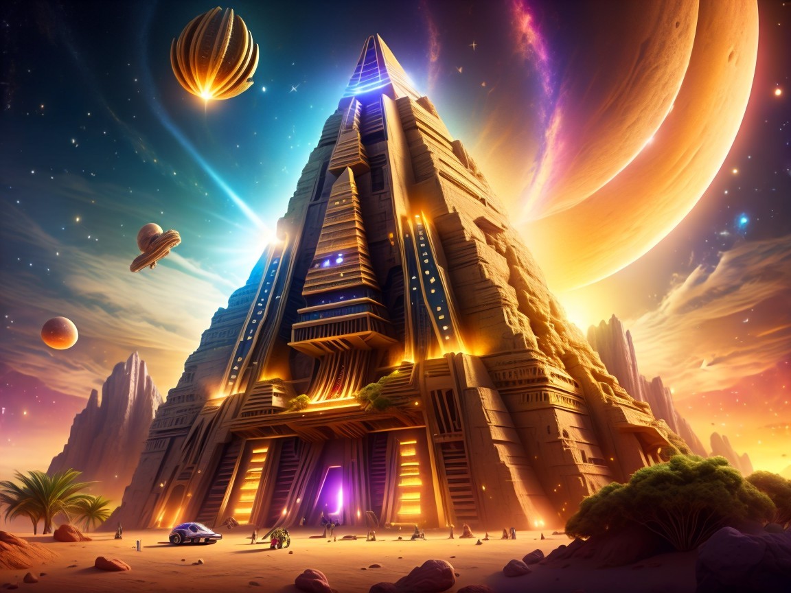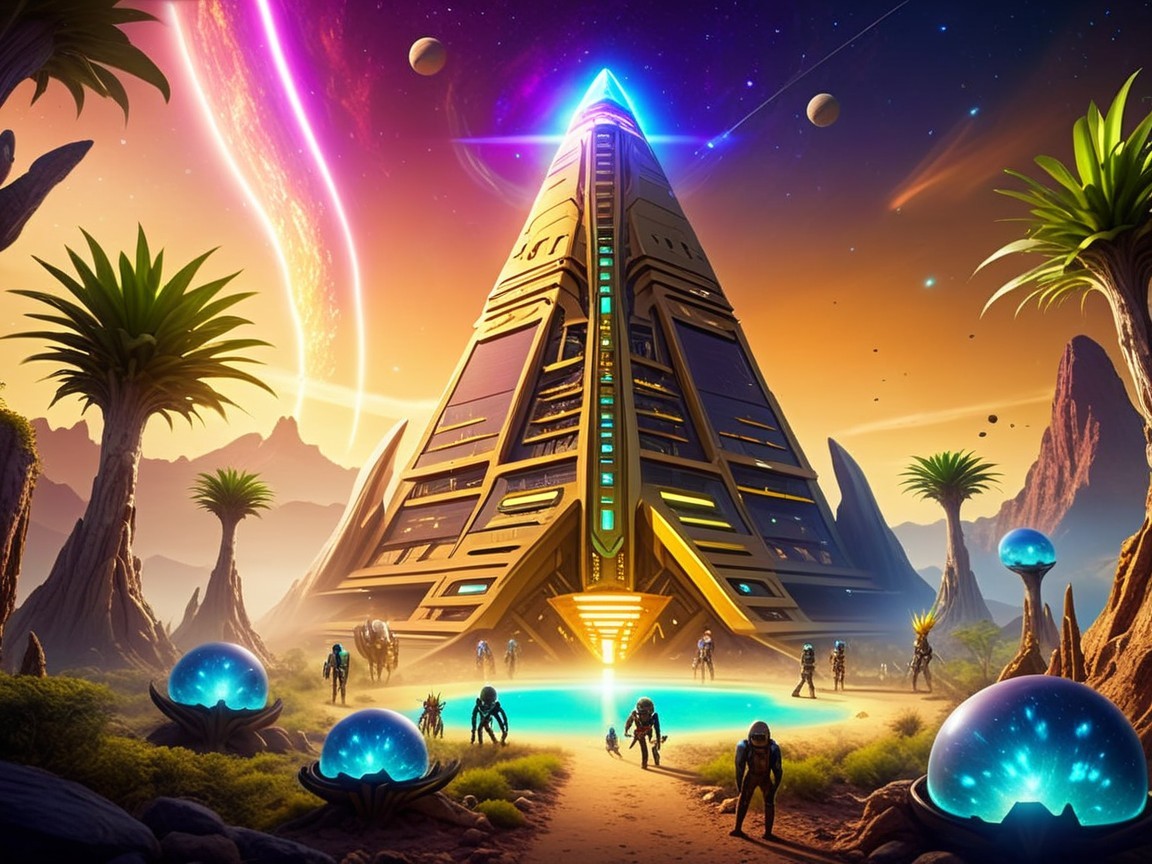 A vibrant sci-fi landscape features a towering pyramid structure illuminated with neon colors, surrounded by floating objects and cosmic elements, while figures explore the otherworldly scene.