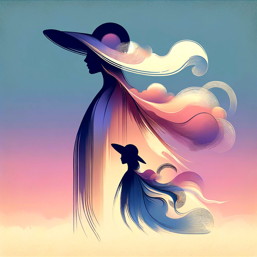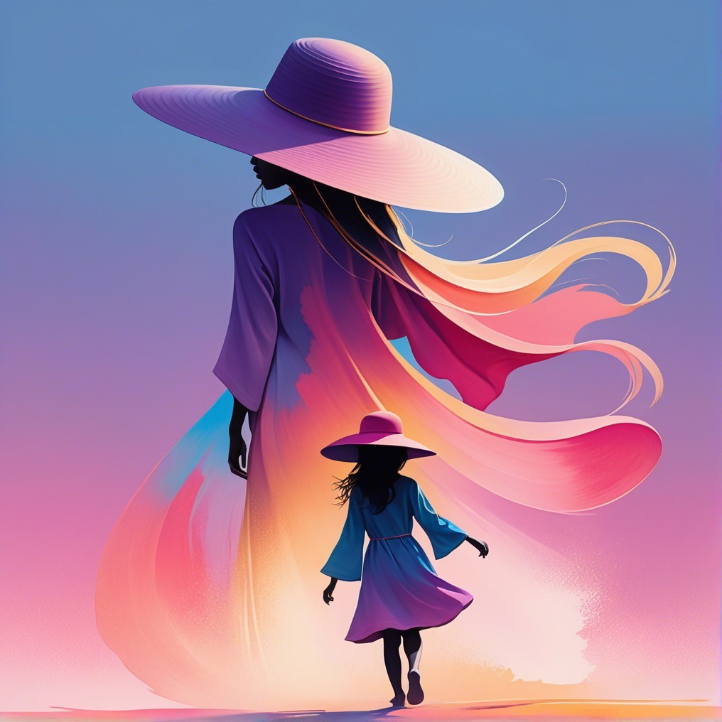 The artwork features a silhouette of a woman and a child holding hands, walking a dog against a vibrant backdrop of swirling colors and abstract flowers, evoking warmth and tranquility.