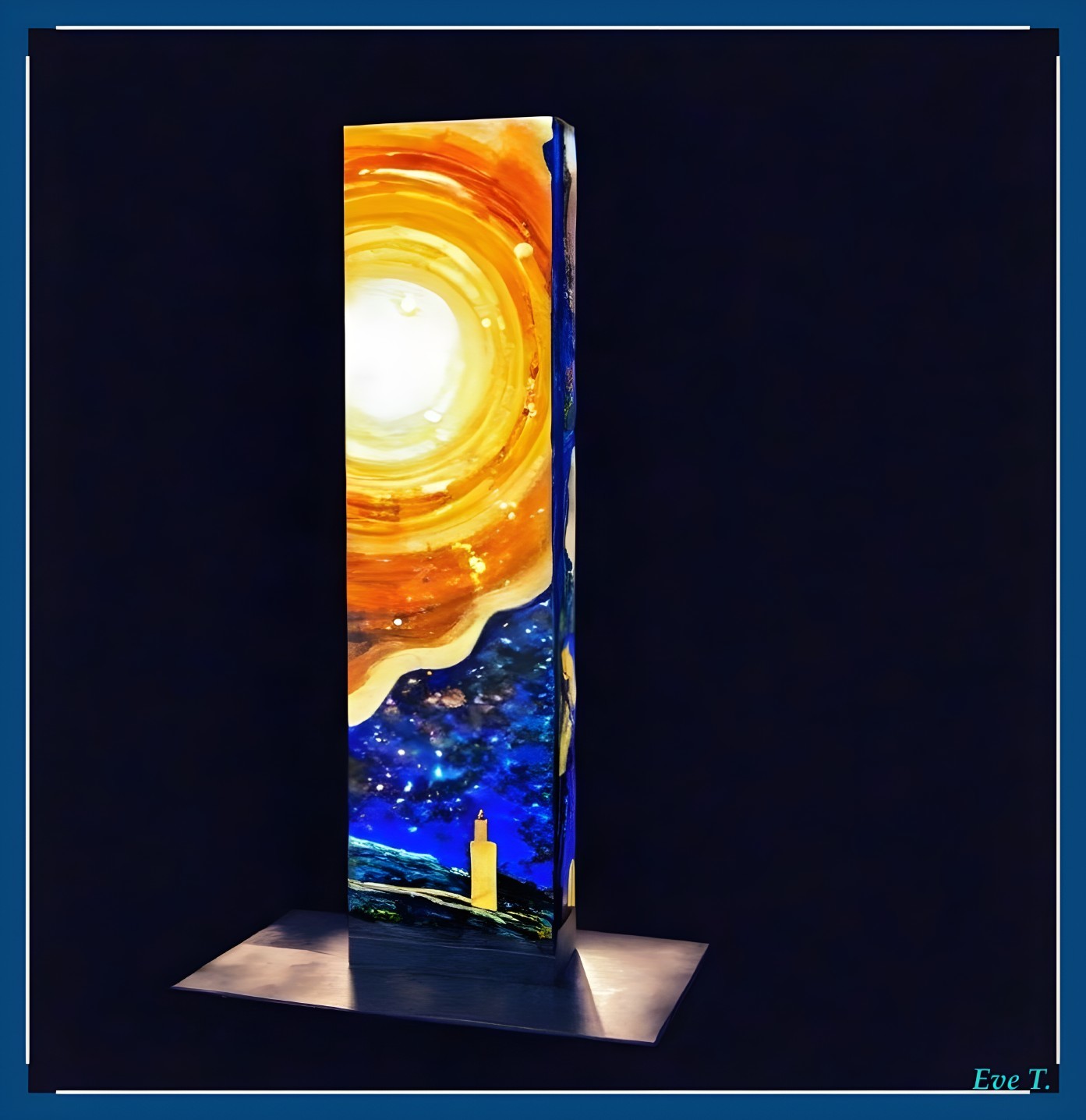 An illuminated rectangular art installation features an abstract depiction of a lighthouse against a vibrant, swirling night sky.