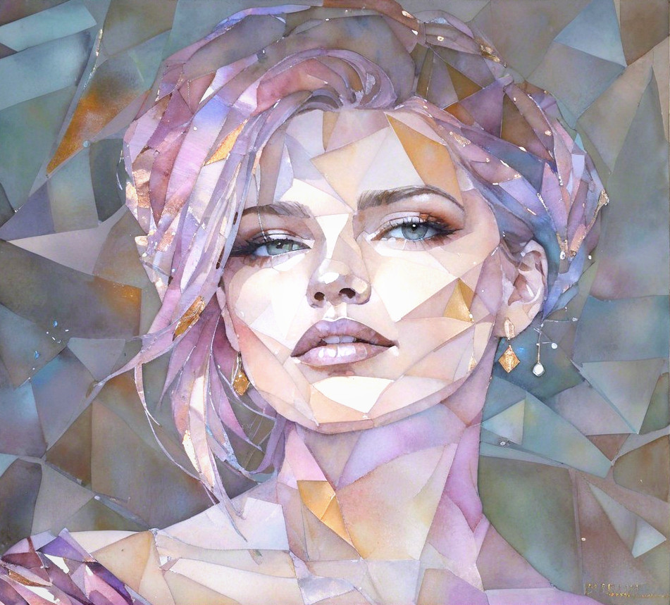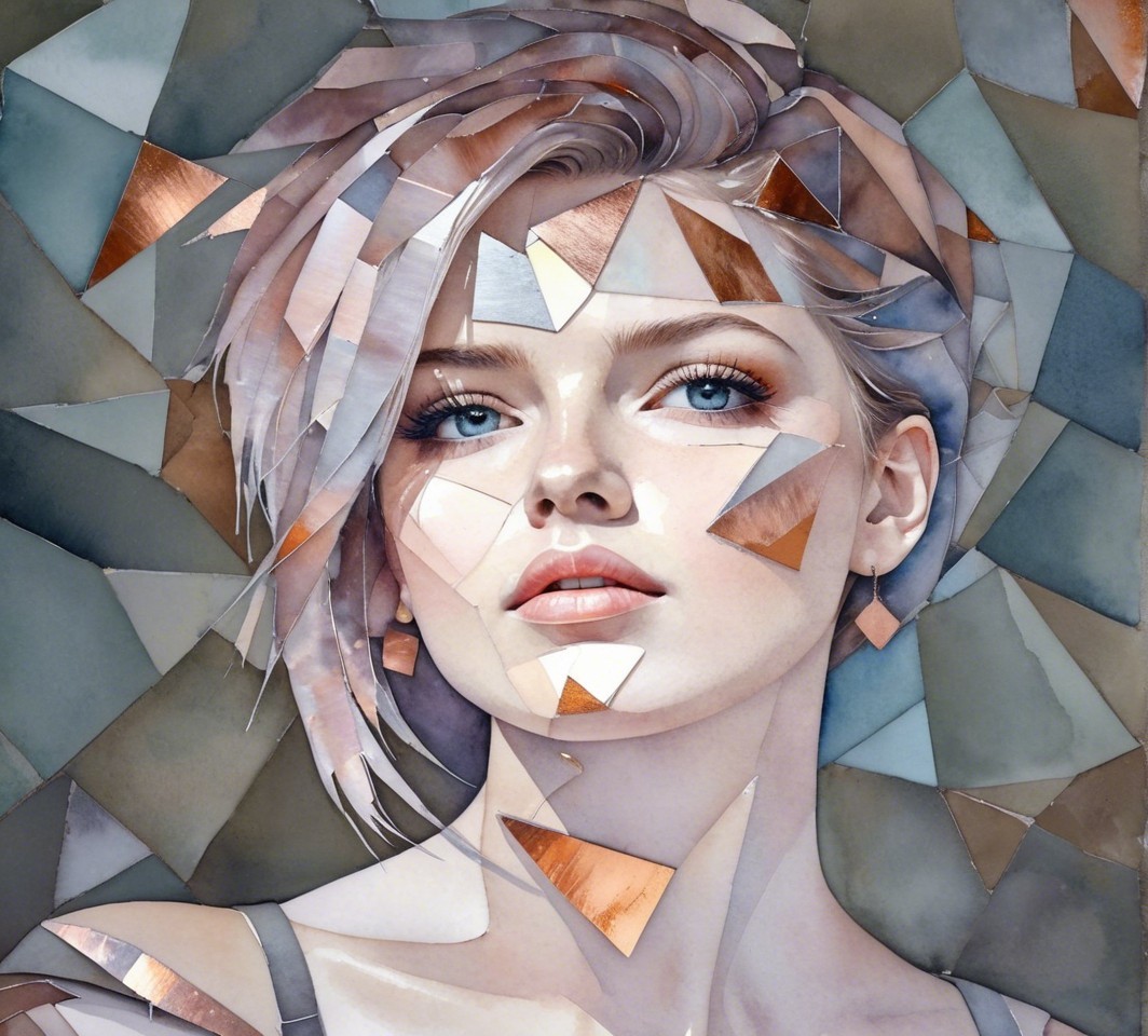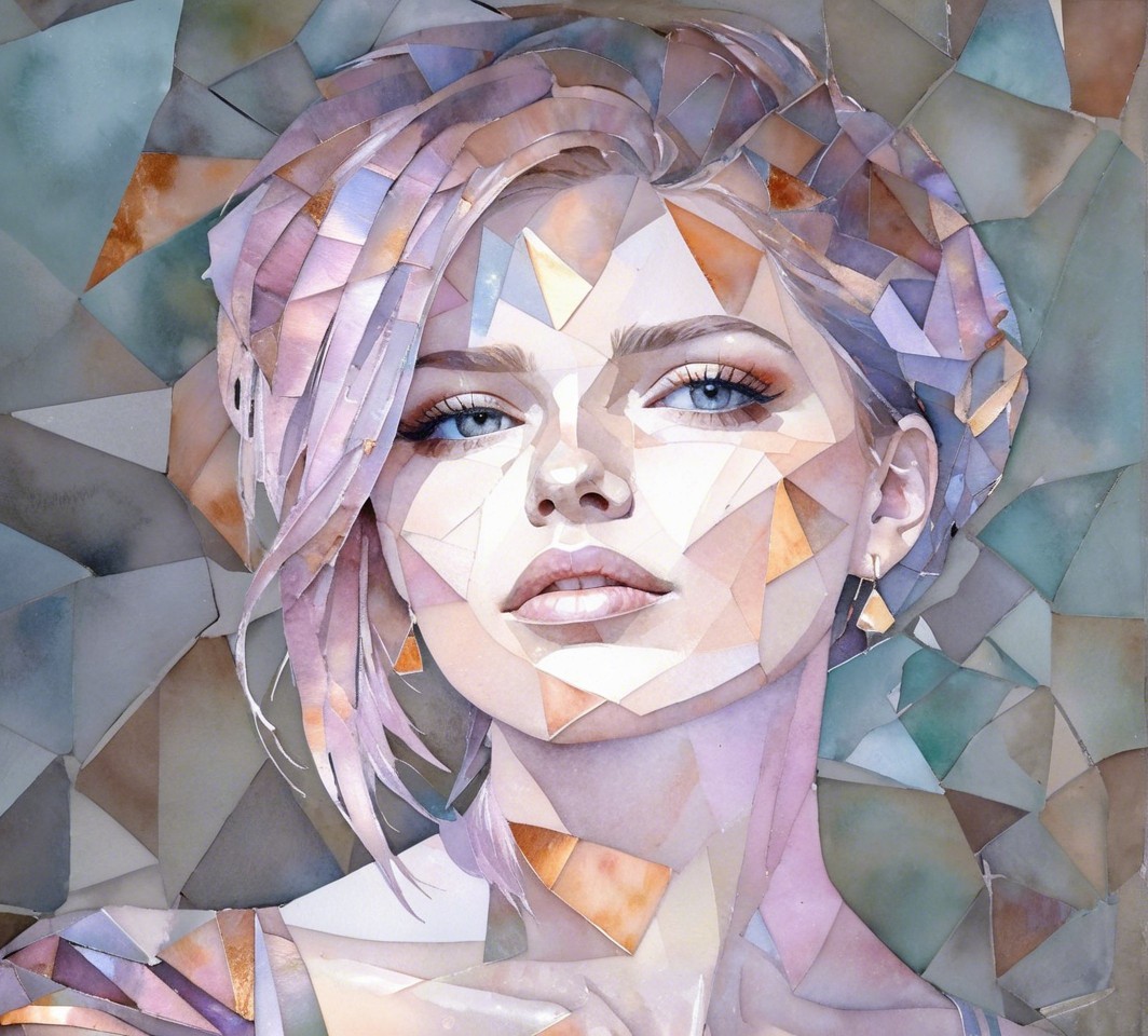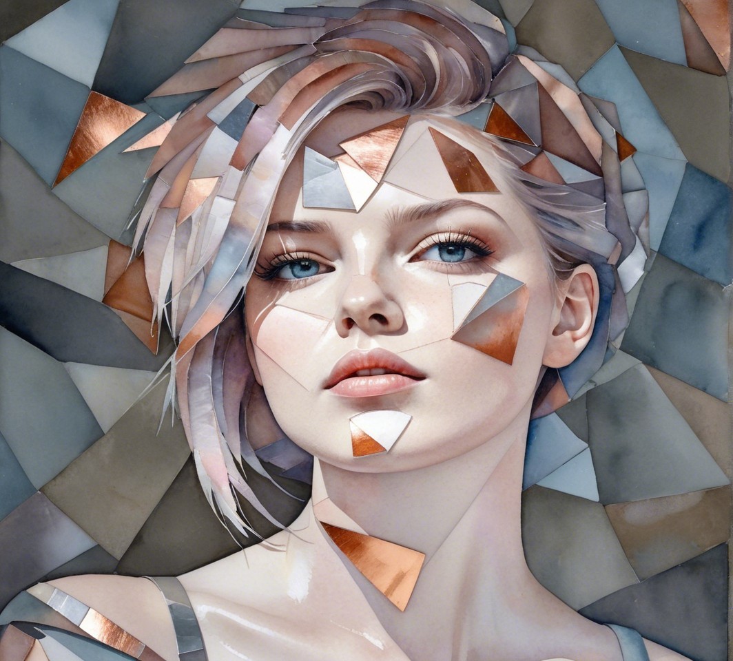 + Prompt:Upper body portrait, geometrical mosaic entirely composed of small shattered pieces of metal: iron, mica, beads, tinc, bronze, copper and gold, embodiment made entirely of shards, watercoloring by Man Ray and Pierre Molinier, watercolor and ink style by Galina Alexandrovna Smirnova, wire details, hues, stylized youthful female, Bloom-Effect, subsurface scattering, textured layers, painterly elements, glossy finish, brightness 1.8, plasticity 1.9, dof, debeh, bokeh, HDR, blurred color schemes, watercolor effect, Raytraced shadows, divisionism, sketch art techniques, luminism evident in the linework, hues inspired by Stan Lee's vibrant style, occult theme, mysterious juvenile, liminal, watercolor and ink in fine-line style, diffused and dappled chiaroscuro lighting, dystopian, cel-shaded style, Henri de Toulouse-Lautrec influence, environment is subdued, pared down to muted light and warmth rises within the neutral palette, atmospheric depth in fractured surrealism, watercolor and ink painting, emerging silhouette rimmed by a cracked shattered glass. asymmetrical streaks of dripping paint, chaotic, marks and flecks, brushwork forming rupture and deconstruction, severe dissonance, fragile dissolved balance.