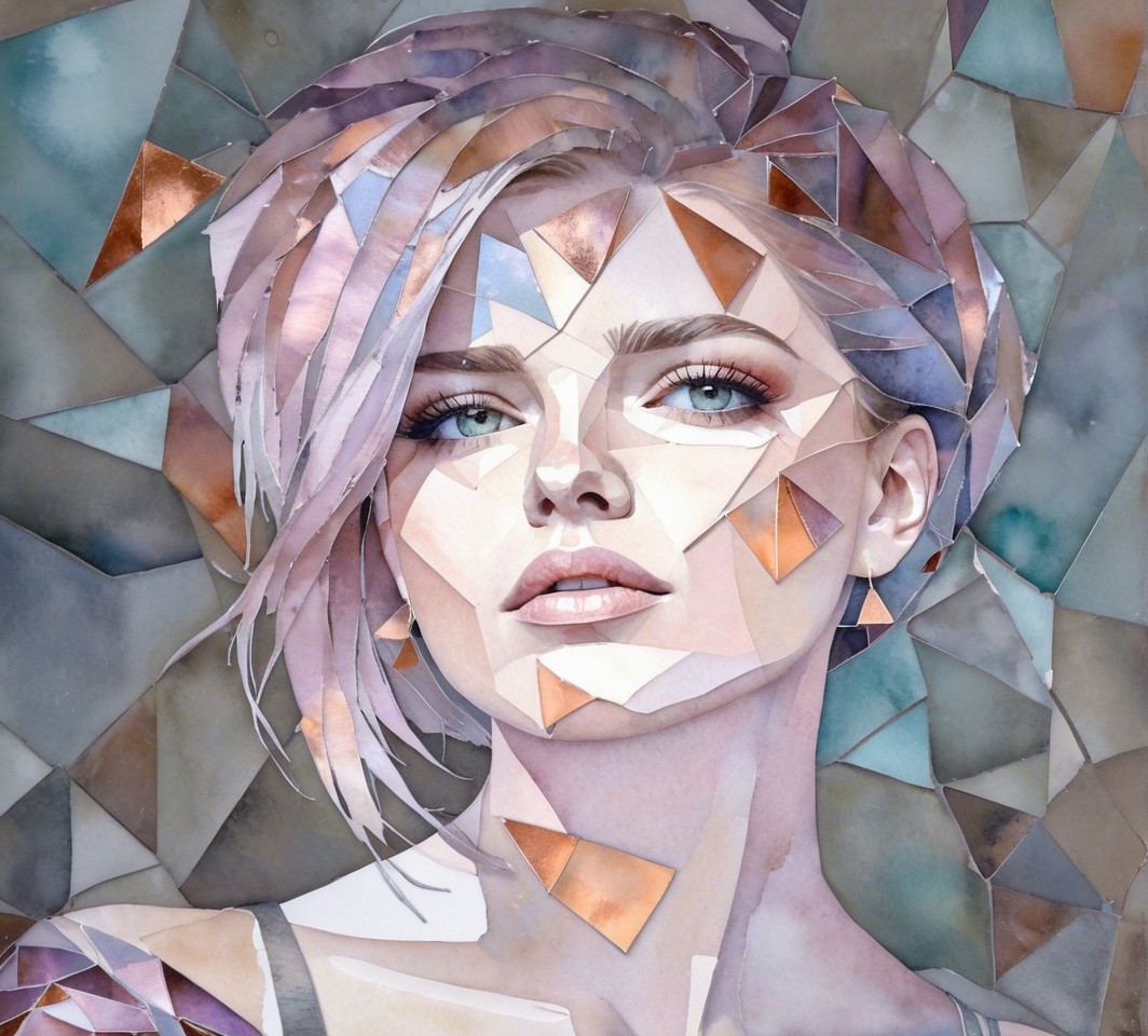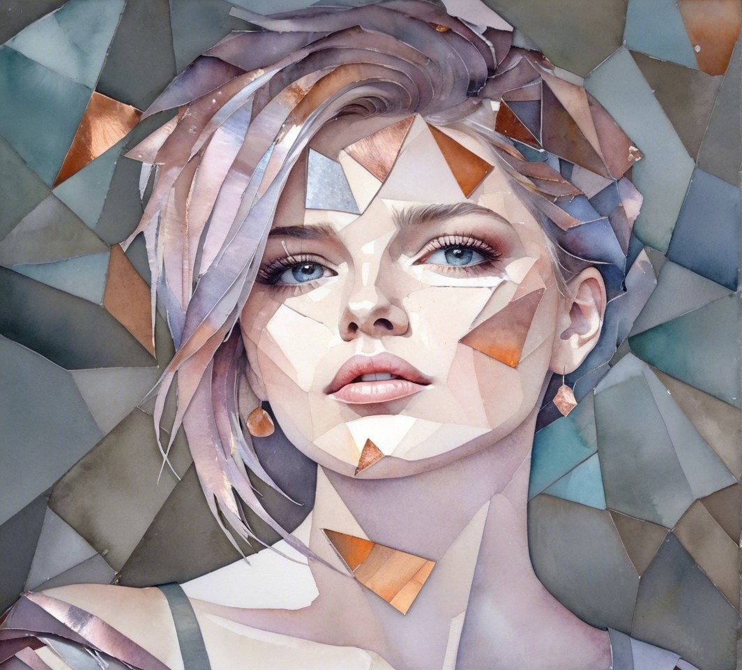 Prompt: Upper body portrait, dissolved geometrical mosaic entirely composed of small shattered pieces of metal: iron, mica, copper, tinc, bronze, embodiment made entirely of shards, precisionism, perpendicular watercoloring by Man Ray and Ed Binkley, watercolor and ink style by Galina Alexandrovna Smirnova, wire details, hues, stylized youthful female, Bloom-Effect, moody, capricious linework, whimsical appearance, temperamental silhouette, changeable, uncertain translucence, subsurface scattering, textured layers, painterly elements, glossy finish, brightness 1.8, plasticity 1.9, dof, debeh, bokeh, HDR, blurred color schemes, watercolor effect, Raytraced shadows, divisionism, sketch art techniques, luminism evident in the linework, hues inspired by Stan Lee's vibrant style, occult theme, mysterious juvenile, liminal, watercolor and ink in fine-line style, diffused and dappled chiaroscuro lighting, dystopian, cel-shaded style, Henri de Toulouse-Lautrec influence, environment is subdued, reduced down to muted light and warmth rises within atmospheric depth in fractured surrealism, watercolor and ink painting, emerging silhouette rimmed by shards of shattered glass. asymmetrical streaks of dripping paint, chaotic, marks and flecks, brushwork forming rupture and deconstruction, wavery textures for severe dissonance, fragile dissolved balance. 3D watercolor doodle illustration, UHD resolution, HDR for vivid colors, depth of field, texture mapping enhancing depth and scale, rounded and playful shapes, textured paper effect, otherworldly flair, mip-mapping, serene blotting quill pen used for embossed hues by Jackson Pollock, warm 3 point lighting, visible textures, stylized woodblock print by Overton Loyd, hatching, ink and a scratching style, chiseled, plasticity 1.2, sgrafitto style, anthropomorphized, weird, chibli, custom_loss: edge, mental, strictness by Mikhail Vrubel and Francisco de Zurbaran, overall composition by Chaim Soutine