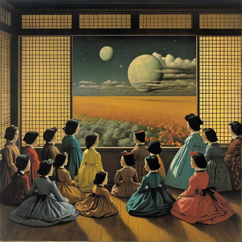 A serene interior features two chairs facing a window with a cosmic scene. Earth, the moon, and a distant planet are visible in a twilight sky above a vast green landscape.