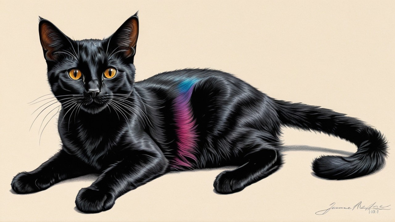 (Try from brigitt@) - A beautifully illustrated black cat lounges gracefully, showcasing its sleek fur and striking golden eyes. A subtle splash of color runs along its back, adding a unique artistic touch.