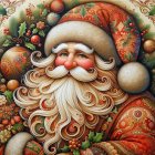 A festive Santa Claus with a long, flowing beard, wearing a red and gold outfit adorned with holly. Surrounded by greenery and red berries, he exudes warmth and holiday cheer.