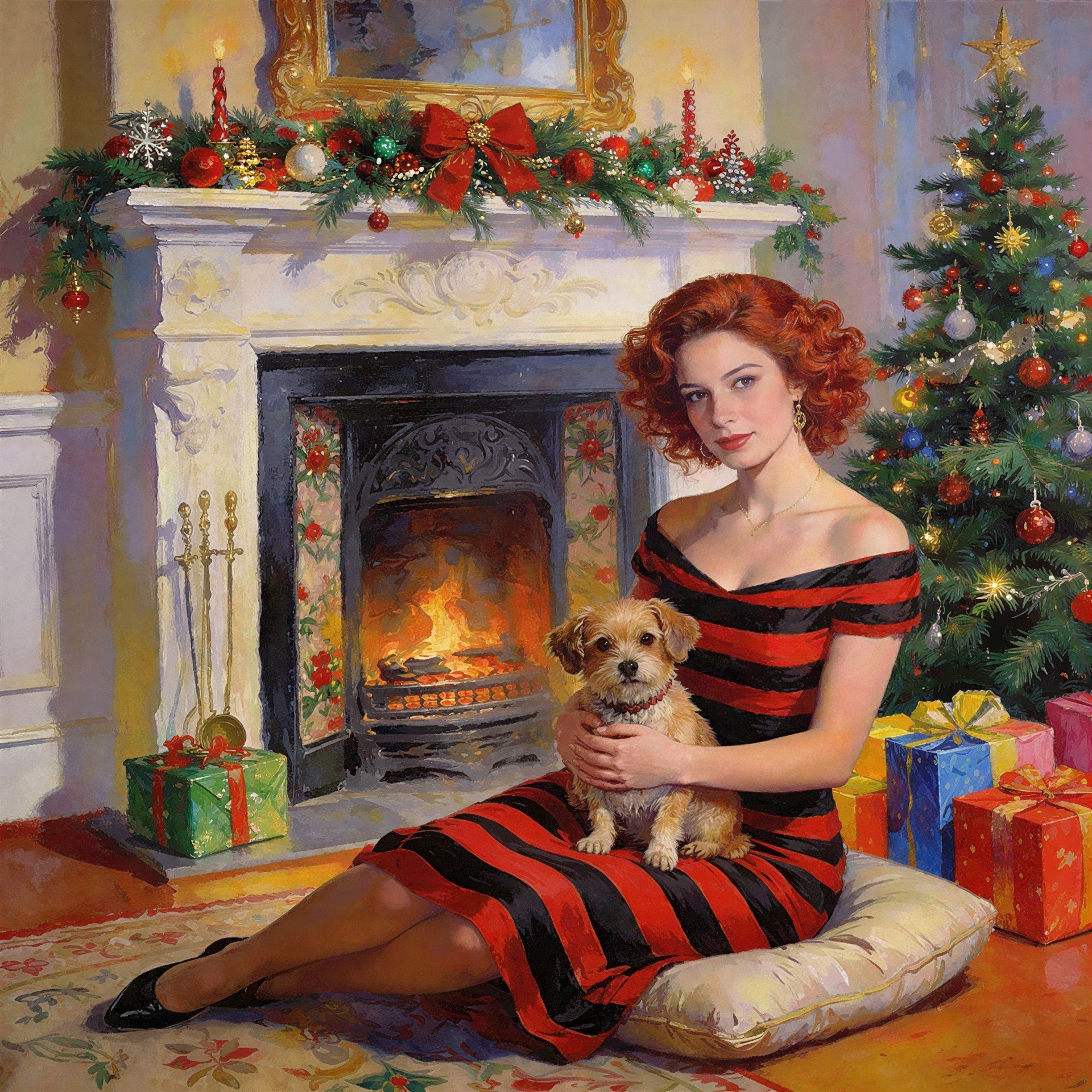 A stunning painting of a young woman with red curly hair and red lipstick, wearing an off-the-shoulder, red and black striped dress. She is seated on a white pillow on the floor, holding a small brown dog with a red collar. Behind her is a fireplace with a lit fire,