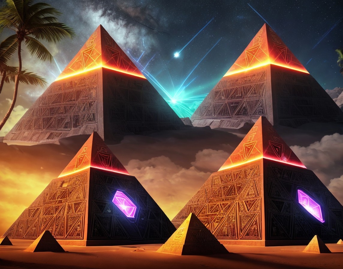 Prompt: UFO with hypnotic geometric lights flying above a tropical island with palm trees, sandy beach and an erupting volcano. High-tech alien temple in a cosmic pyramid assimilated with abstruse sacred geometric patterns and advanced alien technology. geometric hexagonal patterns. flying saucers, pyramid with runes and glowing rock crystals. Supernatural and dynamic landscape under a complex cosmic sky. galactic DMT art, hallucinogenic visionary vibes, sci-fi LSD art. In the style of Cameron Gray