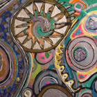 A vibrant, artistically exaggerated pub scene featuring colorful walls, swirling patterns, and two patrons at the bar, creating a lively and whimsical atmosphere.