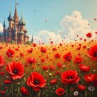 A vibrant landscape features a towering, surreal tree with intricate branches, surrounded by striking red foliage. Soft clouds drift in a blue sky, while figures wander the enchanted hills below.